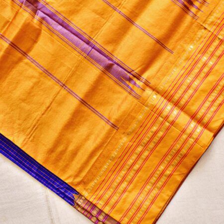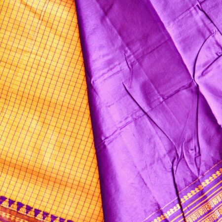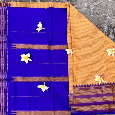 ₹13,000.00Original price was: ₹13,000.00.₹9,000.00Current price is: ₹9,000.00.A gorgeous Narayanpet handloom saree featuring a deep royal blue body, stylish mustard yellow checked pallu, and classic purple-gold temple zari border. Lightweight, elegant, and perfect for festive occasions, weddings, and traditional wear.