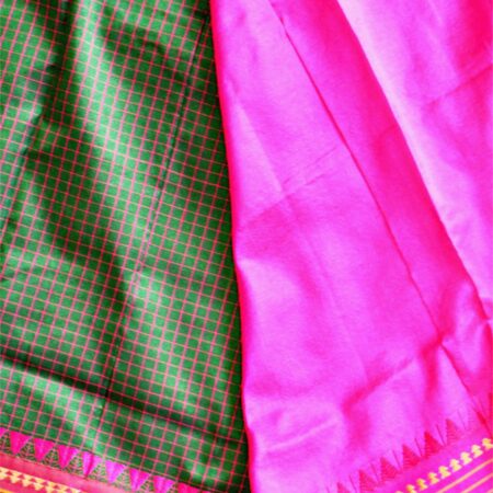 ₹12,500.00Original price was: ₹12,500.00.₹8,500.00Current price is: ₹8,500.00.Celebrate the colors of tradition with this Dark Pink and Light Green Narayanpet Handloom Silk Saree, adorned with a beautiful purple zari border that exudes richness and grace. Handwoven by the skilled artisans of Narayanpet, Telangana, this saree reflects a legacy of weaving excellence carried through generations.