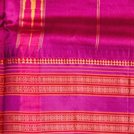 ₹12,500.00Original price was: ₹12,500.00.₹8,500.00Current price is: ₹8,500.00.Celebrate the radiance of tradition with this Golden Yellow and Dark Pink Narayanpet Handloom Silk Saree, beautifully handwoven by the artisans of Telangana. The golden yellow silk body exudes warmth and festivity, perfectly balanced by the rich dark pink border and pallu, detailed with intricate golden zari work that adds a regal touch.