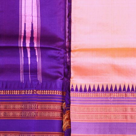 ₹12,500.00Original price was: ₹12,500.00.₹8,500.00Current price is: ₹8,500.00.Grace and tradition come alive in this Light Pink and Purple Narayanpet Handloom Silk Saree, delicately handwoven by the artisans of Telangana. The soft light pink body brings a touch of femininity and serenity, while the deep purple border adds a bold and regal contrast.
