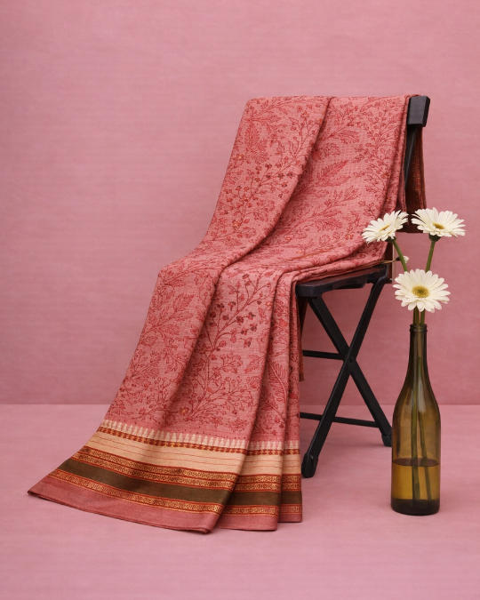 Embrace a sophisticated, grounded look with this Brown Narayanpet Cotton Saree. Featuring delicate rose-hued floral vines and a soft pink temple border, this handwoven cotton saree by Telangana’s artisans is the perfect blend of vintage charm and modern comfort.