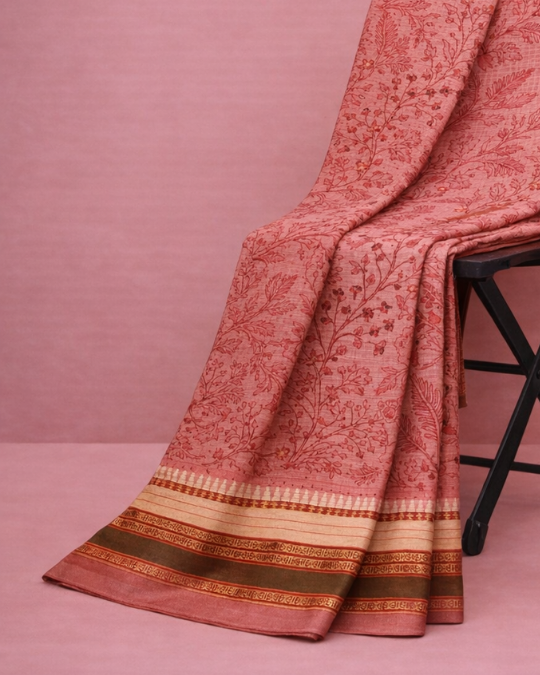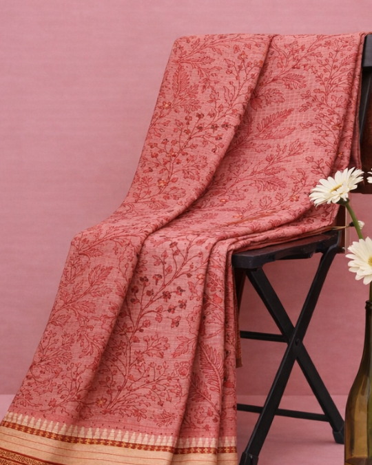 This saree is a tribute to the muted beauty of nature. The deep coffee-brown body acts as a canvas for flowing botanical vine prints, beautifully framed by a soft pink “Gopuram” temple border. Directly sourced from the weaver clusters of Telangana, this pure cotton piece brings 17th-century craftsmanship into your daily professional wardrobe.