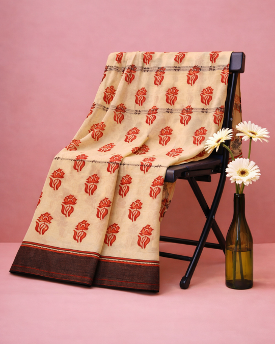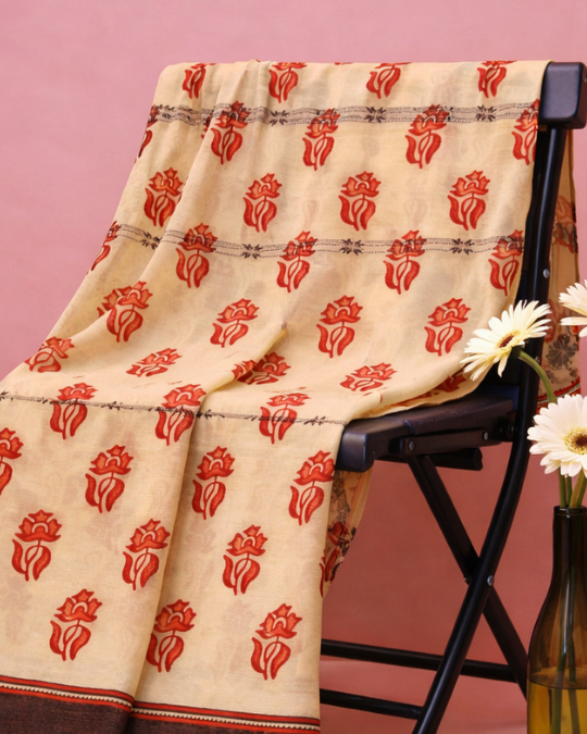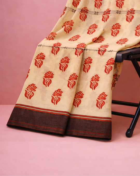 Cream & Terracotta Printed Narayanpet Handloom Cotton Saree