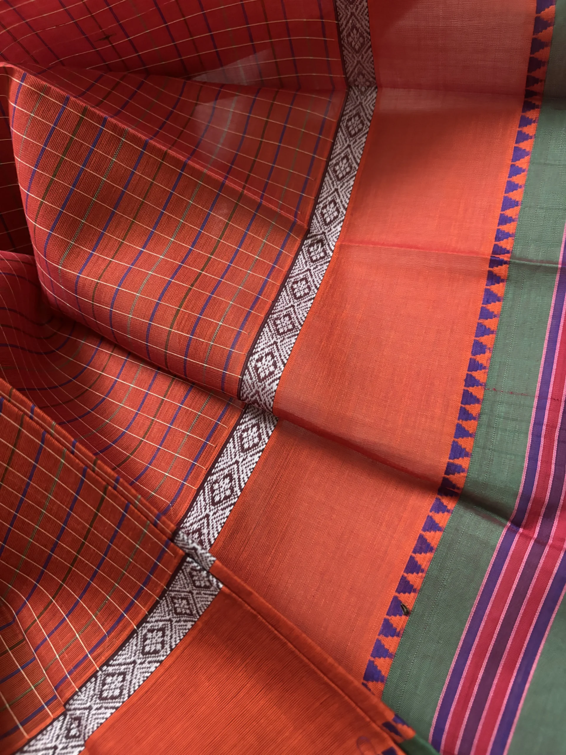 Boldly traditional and structurally superior. This Narayanpet Handloom Cotton Saree features a vibrant Crimson Red and Mustard Yellow multi-checkered body. Grounded by a wide Forest Green border with Navy Blue temple accents and a silver-white diamond-weave band, it offers a crisp, breathable drape for a commanding professional or traditional look.