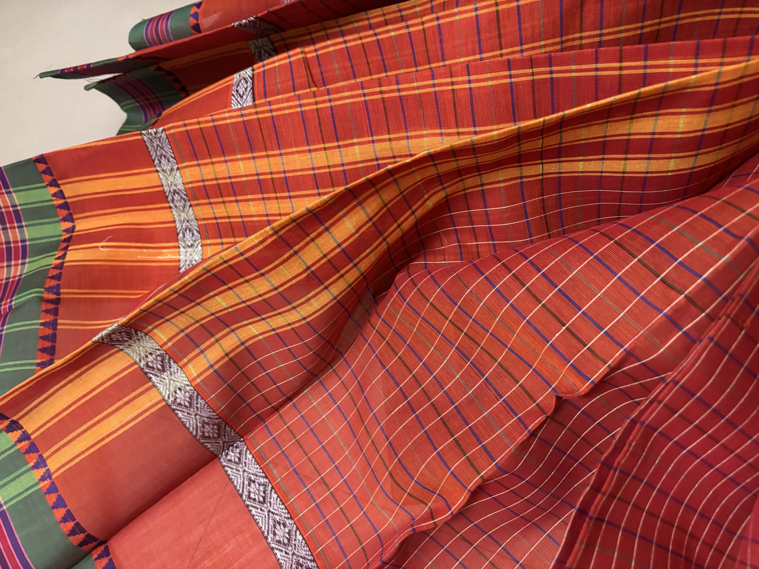Crimson Red & Mustard Multi-Check Narayanpet Handloom Cotton Saree with Forest Green Border