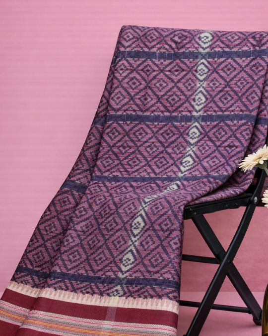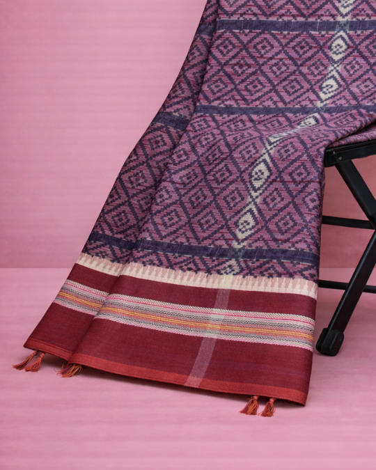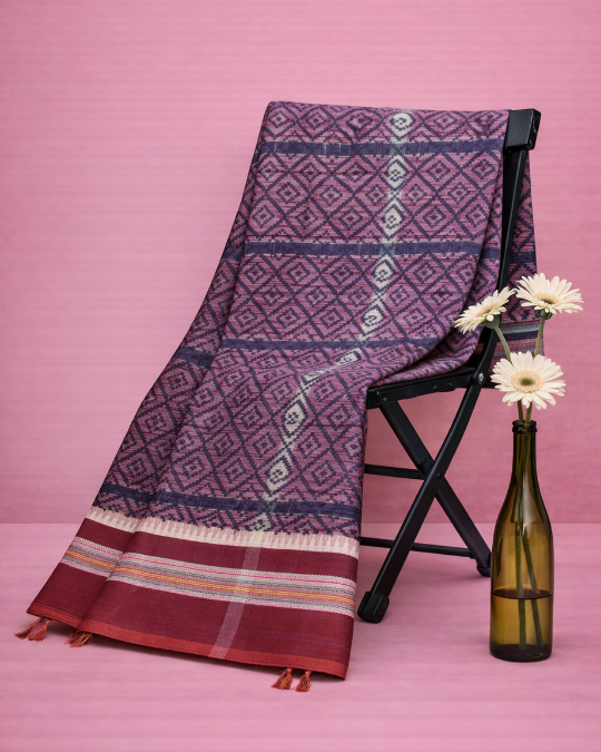 This saree celebrates the architectural precision of the Narayanpet weaving tradition. The rich purple body is adorned with rhythmic geometric diamond patterns, beautifully contrasted by a deep maroon border. It is a tribute to the 17th-century heritage of the Telangana weaver clusters, redesigned for the modern aesthetic.