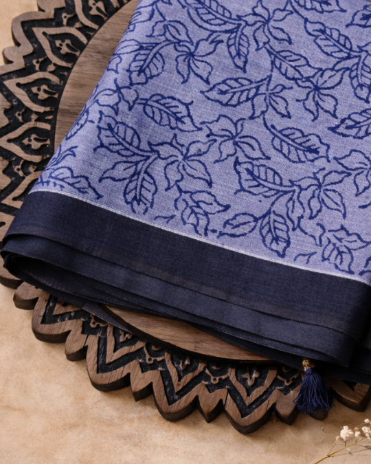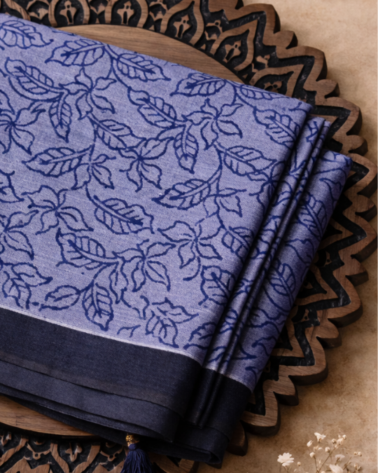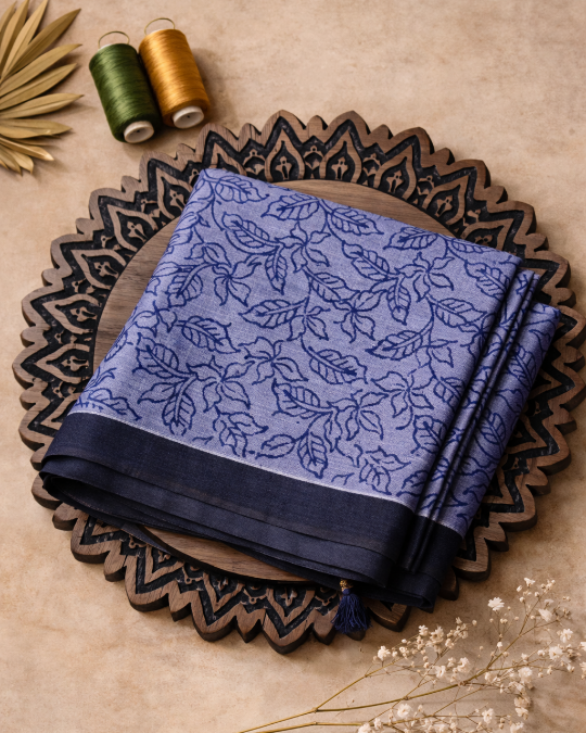 This saree blends minimalism with heritage detailing. The steel blue base is adorned with flowing navy leaf motifs that create an elegant, continuous pattern across the body. The design is subtle yet expressive — ideal for women who prefer refined statement pieces.