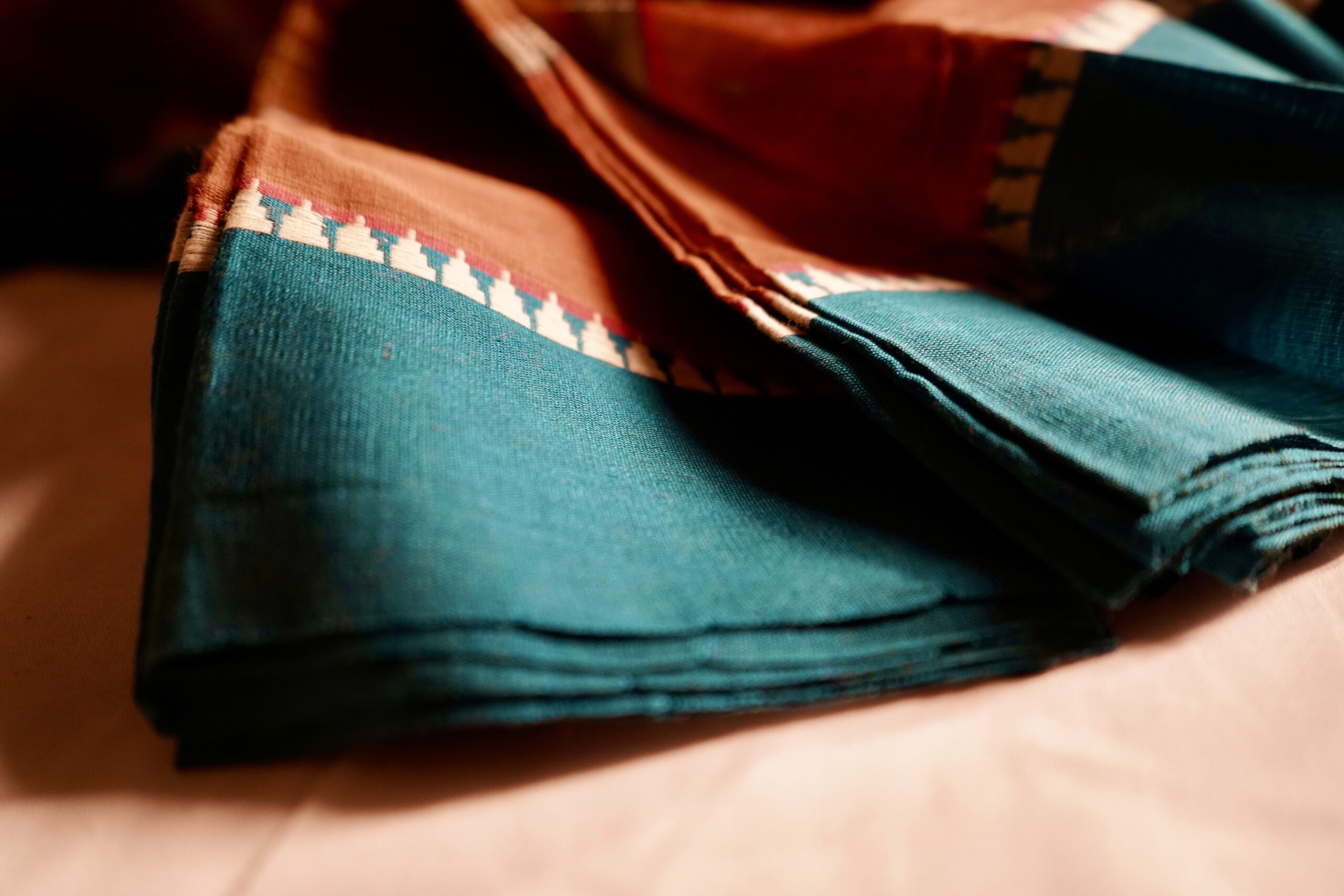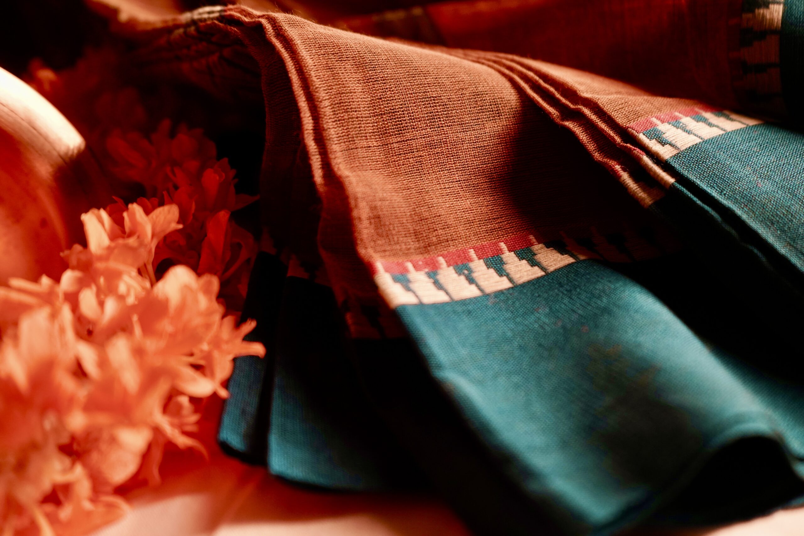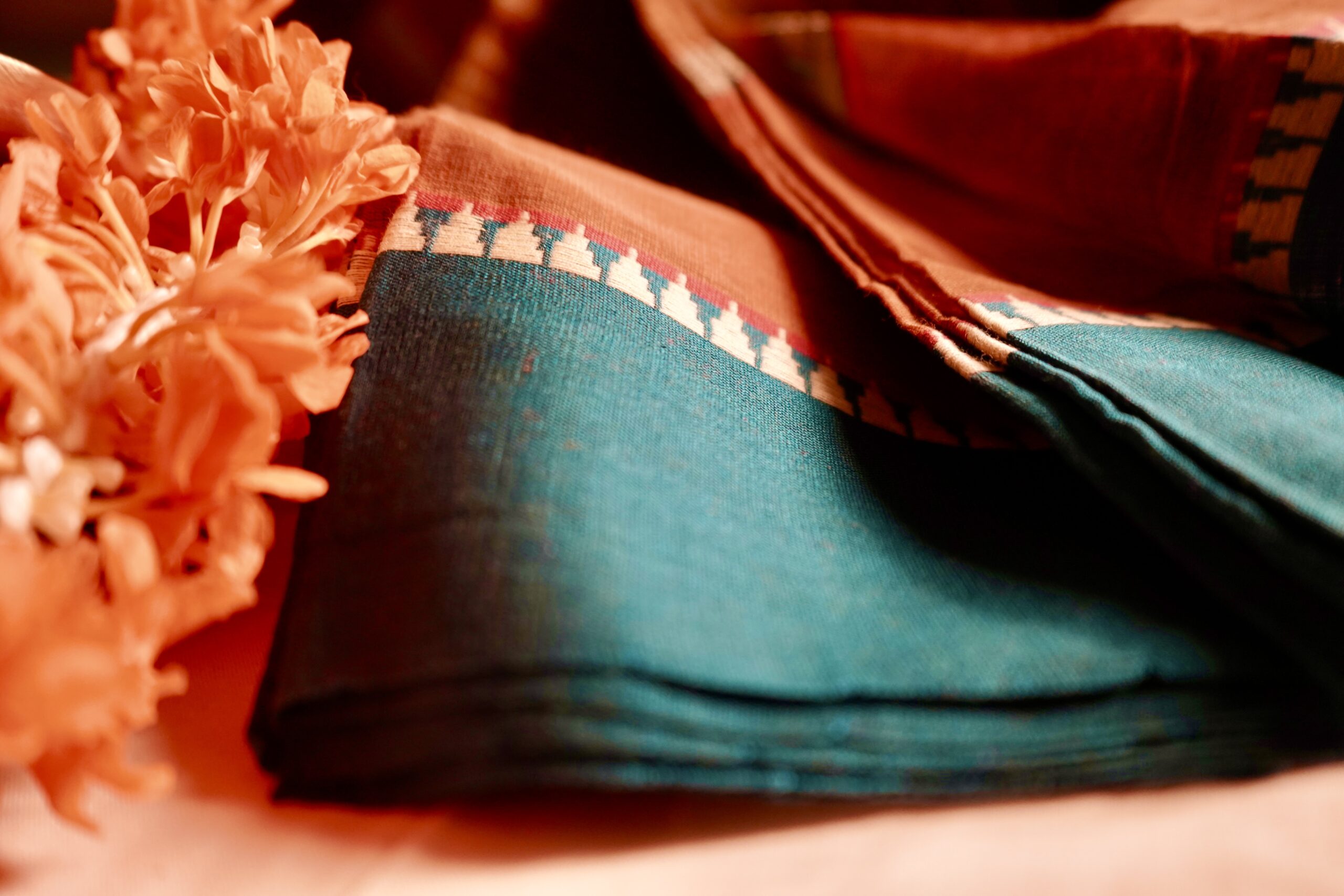 Earthy brown handloom cotton saree with teal border and geometric motif detailing.