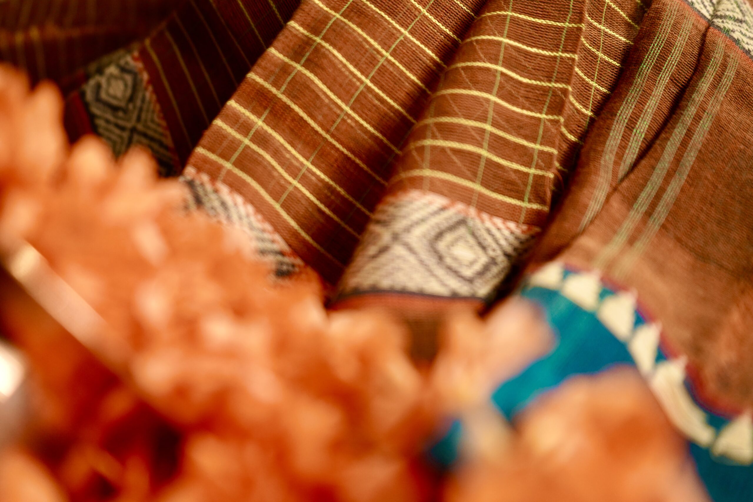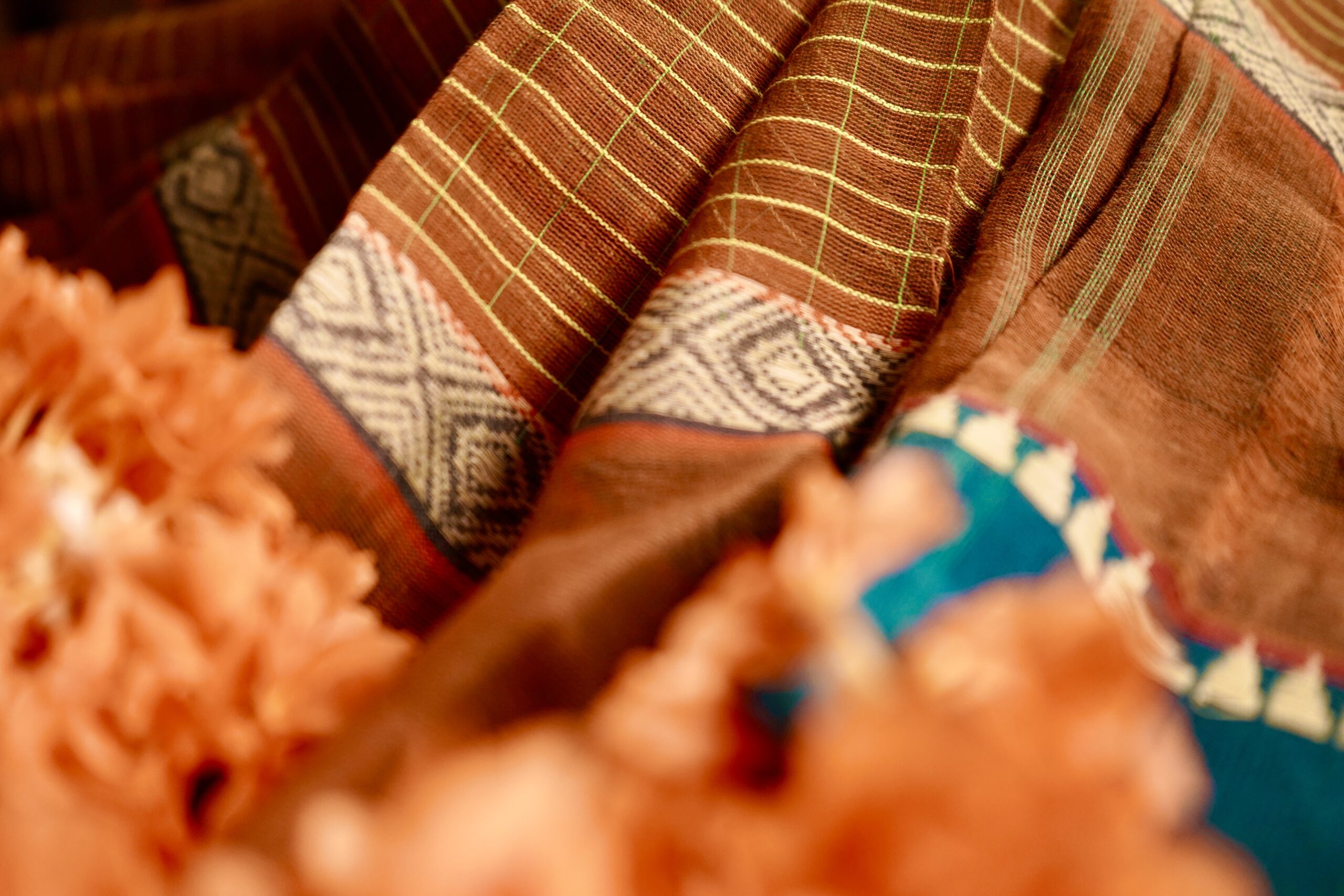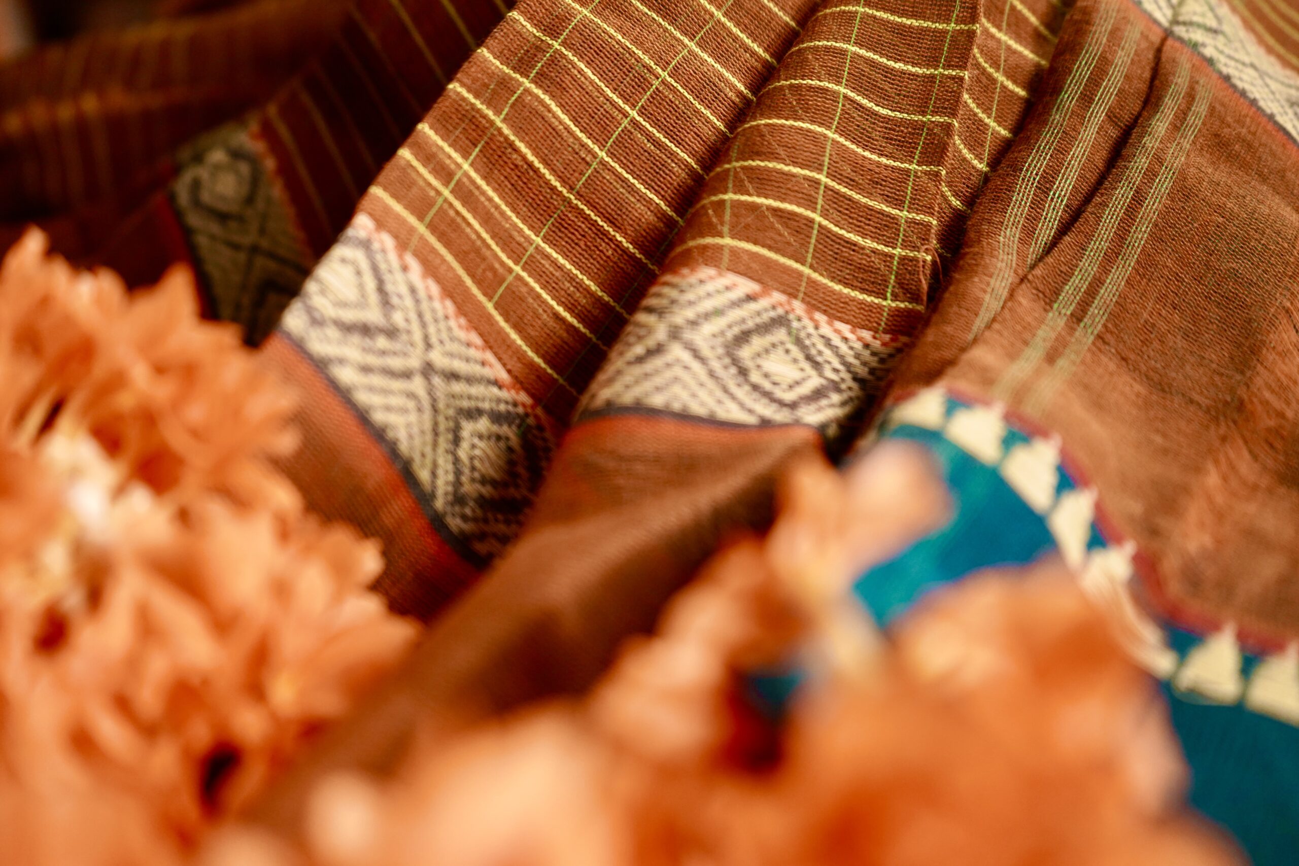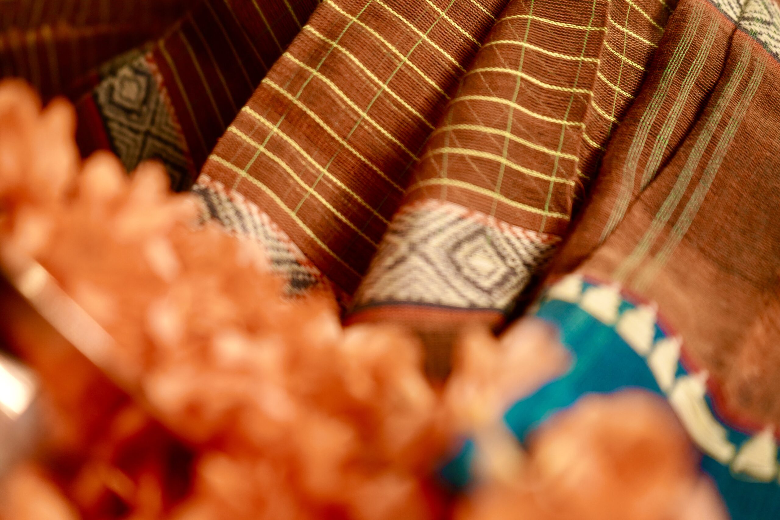 Earthy brown handloom cotton saree with teal border and geometric motif detailing.