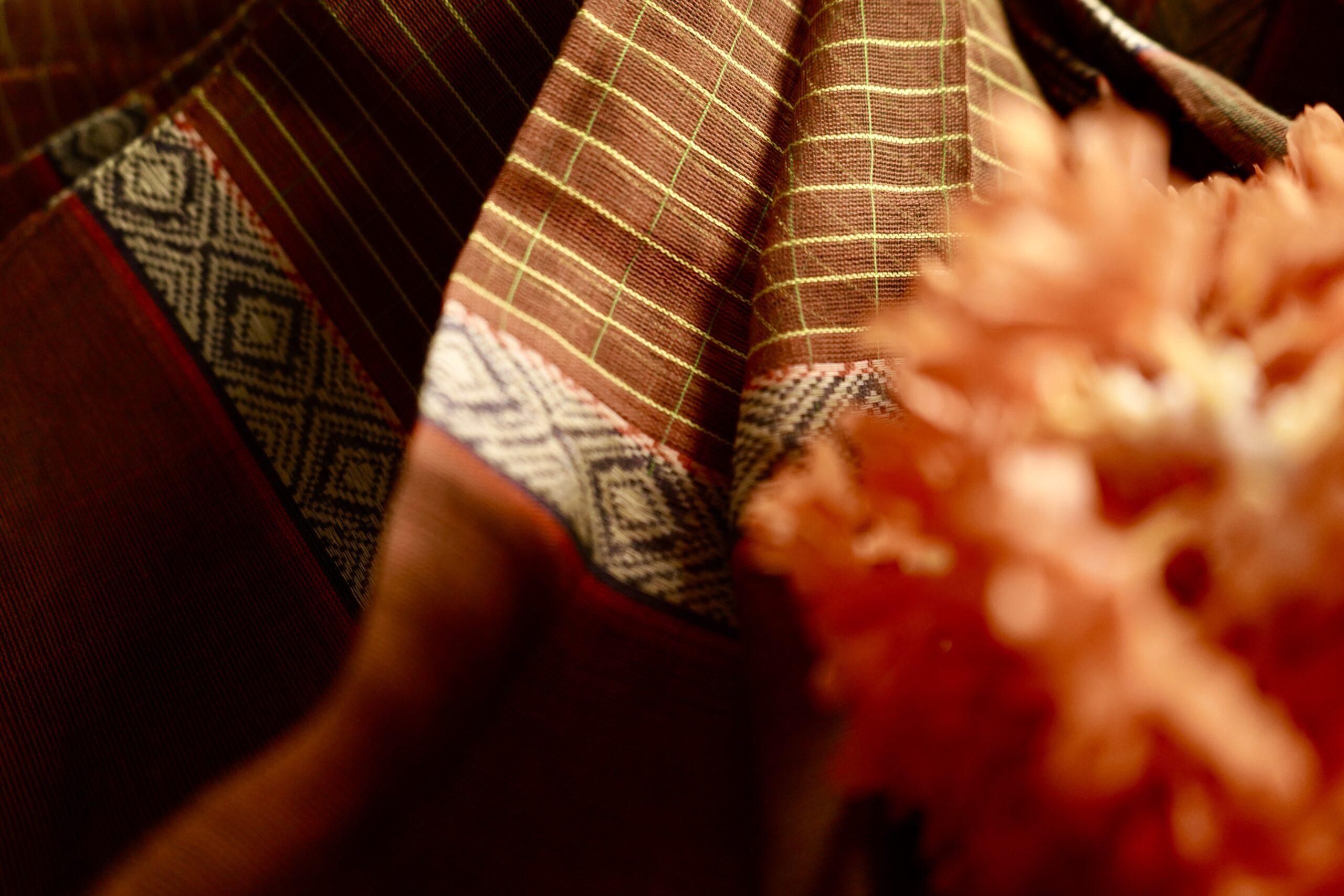 Rooted in traditional craftsmanship with a contemporary earthy palette this handloom cotton saree features a warm brown body detailed with fine line checks. The border is adorned with intricate geometric motifs in ivory and black, adding artisanal depth and character to the weave.