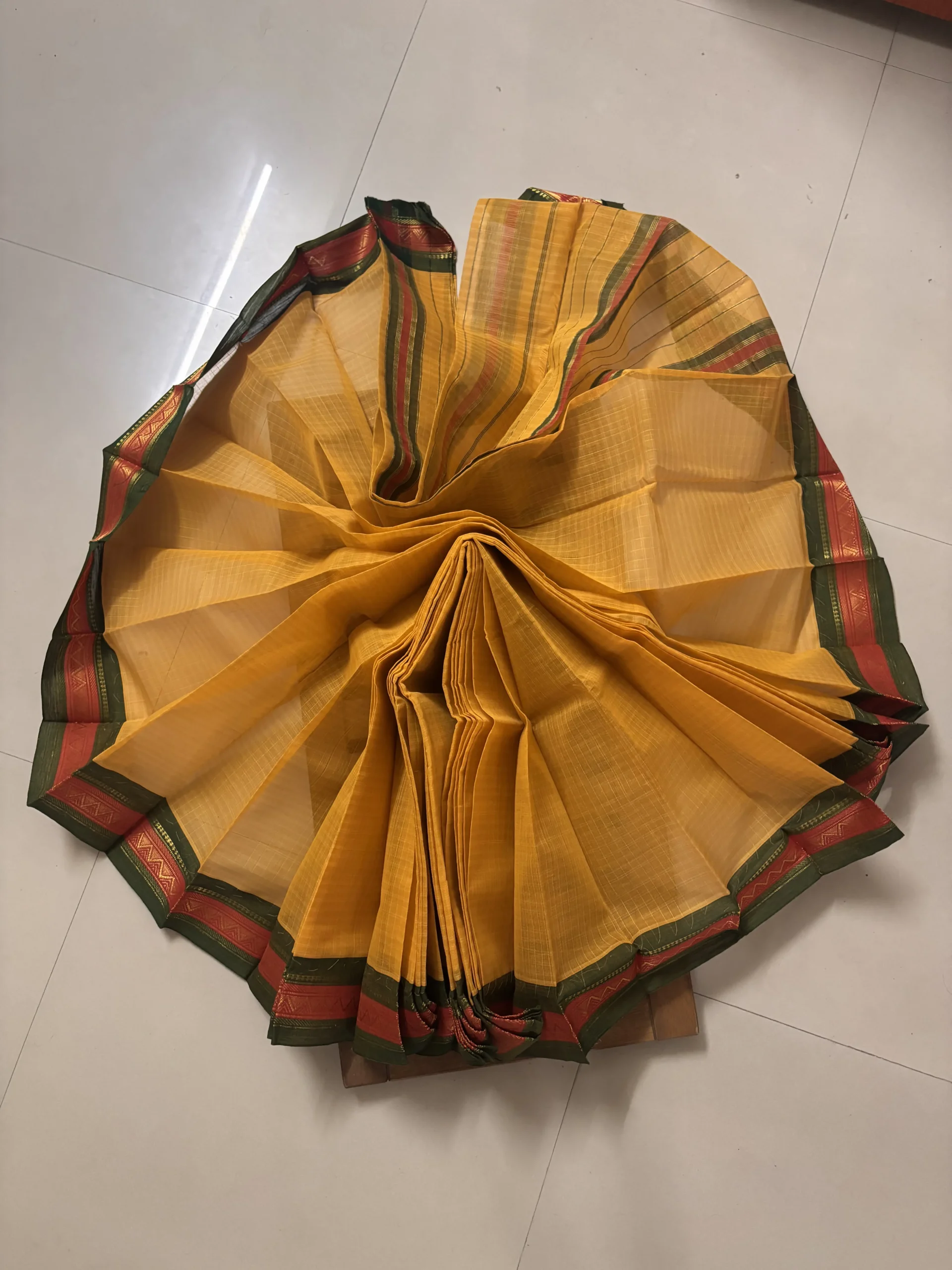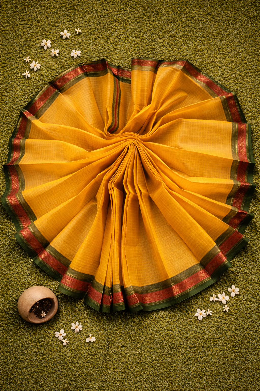 Golden Mustard & Maroon Checked Narayanpet Handloom Cotton Saree with Temple Border