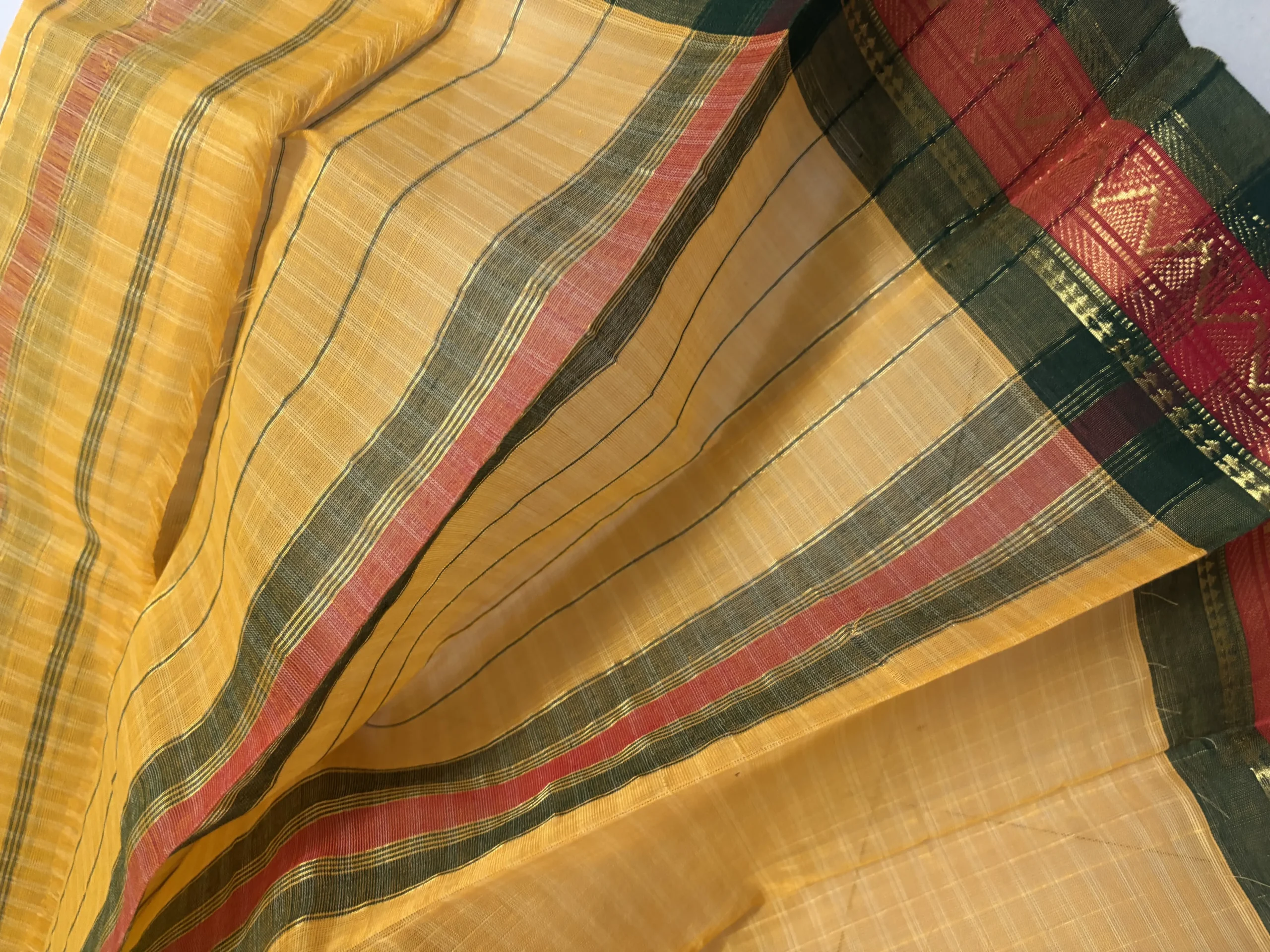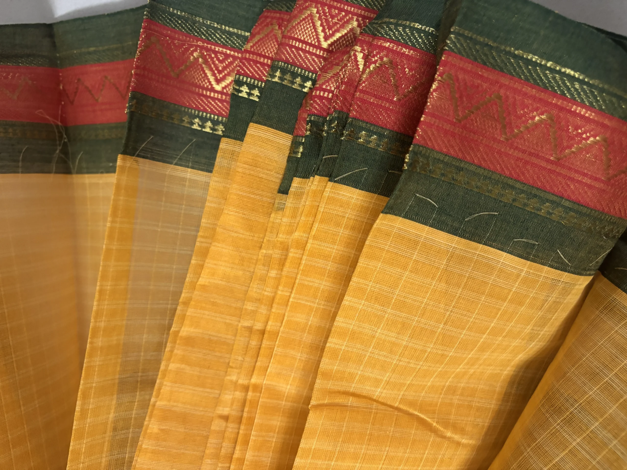 Golden mustard Narayanpet handloom cotton saree with checked pattern and maroon border