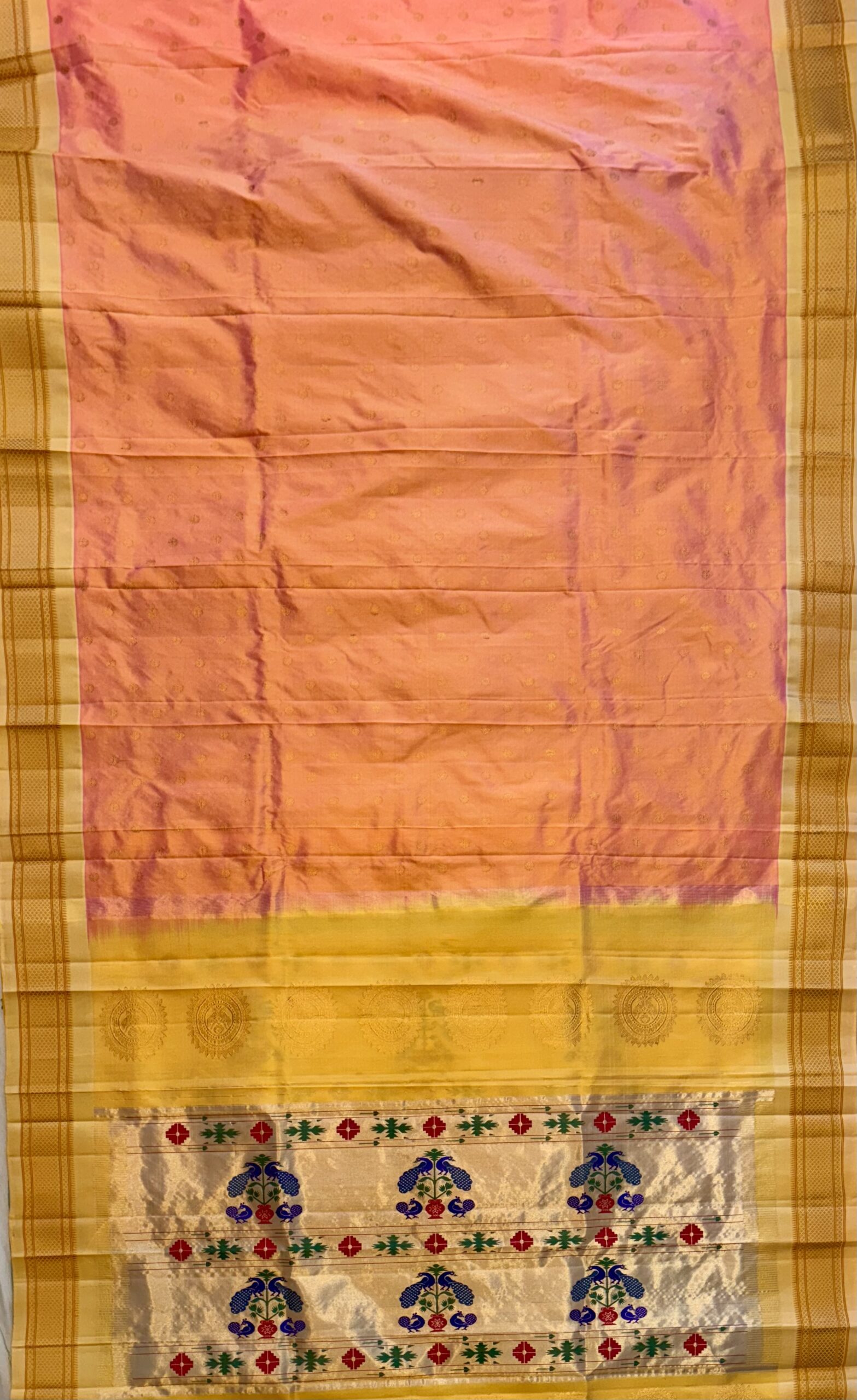 The saree showcases a beautiful dual-tone orange and pink body adorned with subtle woven butta motifs, complemented by a classic yellow gold zari border that enhances its regal elegance. The highlight of the saree is its grand silver zari pallu featuring vibrant peacock and floral motifs, reflecting authentic Narayanpet craftsmanship.