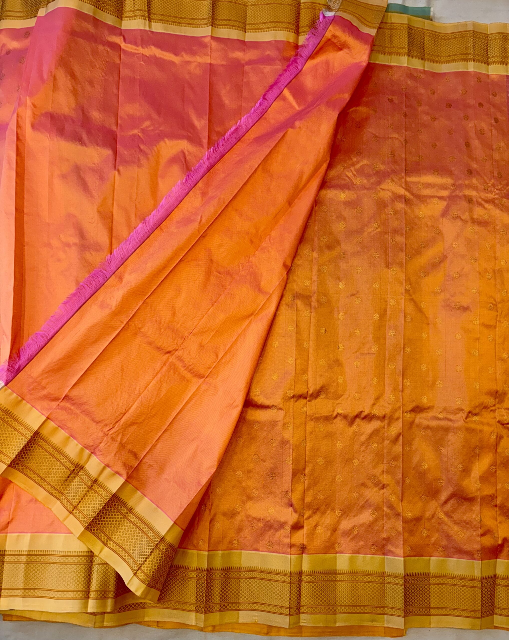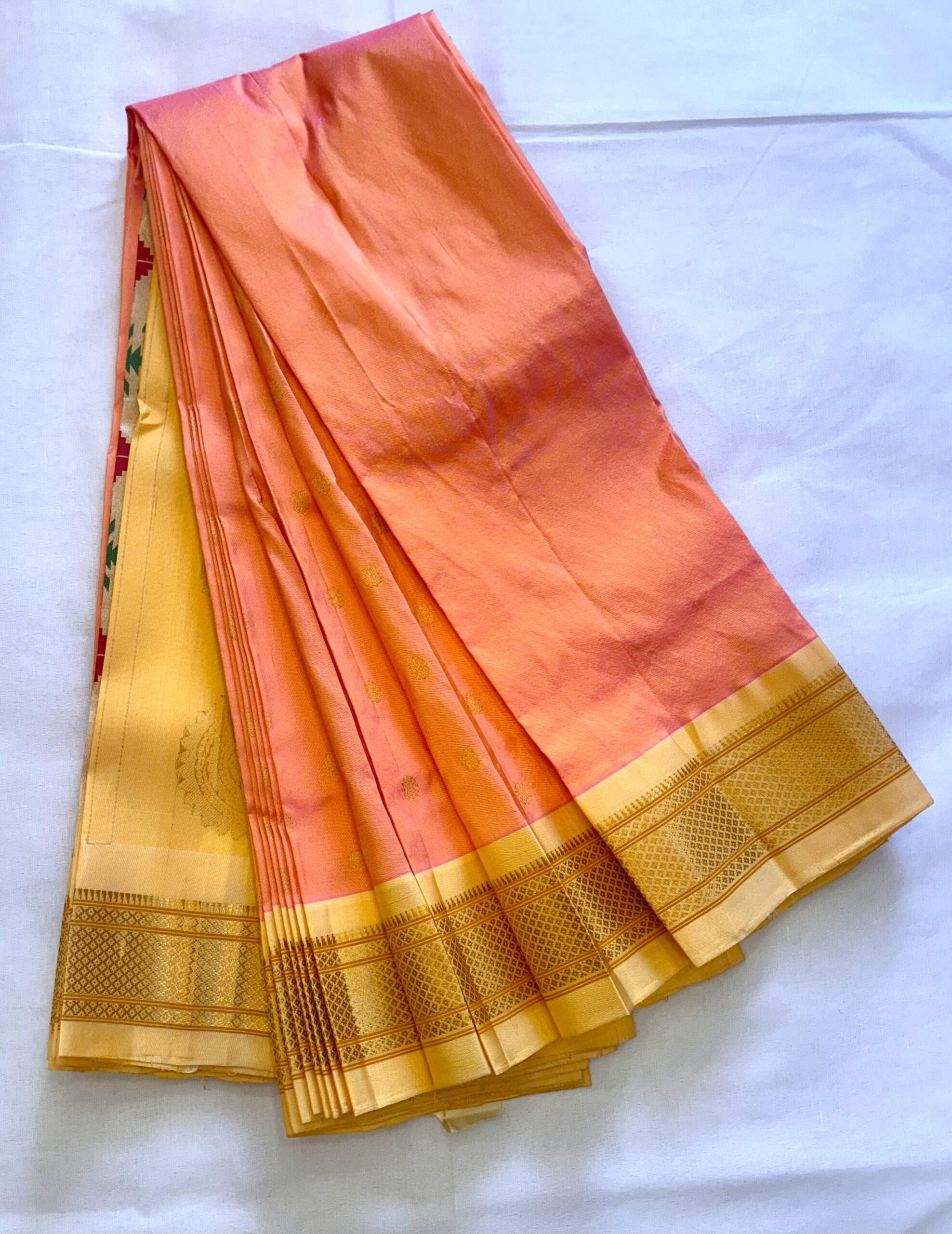 Narayanpet Silk Saree – Dual Tone Orange & Pink Body with Yellow Zari Border and Rich Silver Zari Pallu