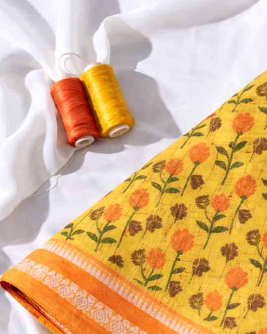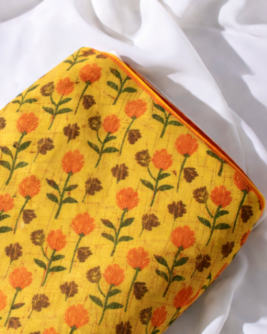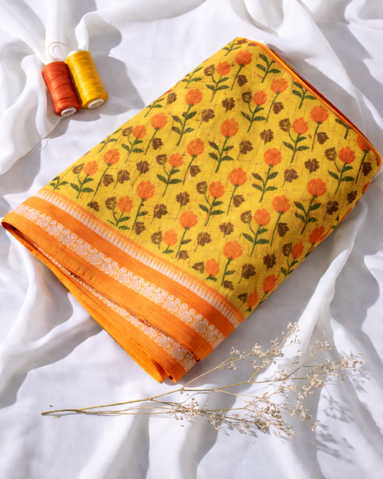 This saree radiates warmth and joyful elegance. The lemon yellow base is adorned with repeating orange floral motifs complemented by earthy brown accents and green stems, creating a lively yet balanced pattern across the body.