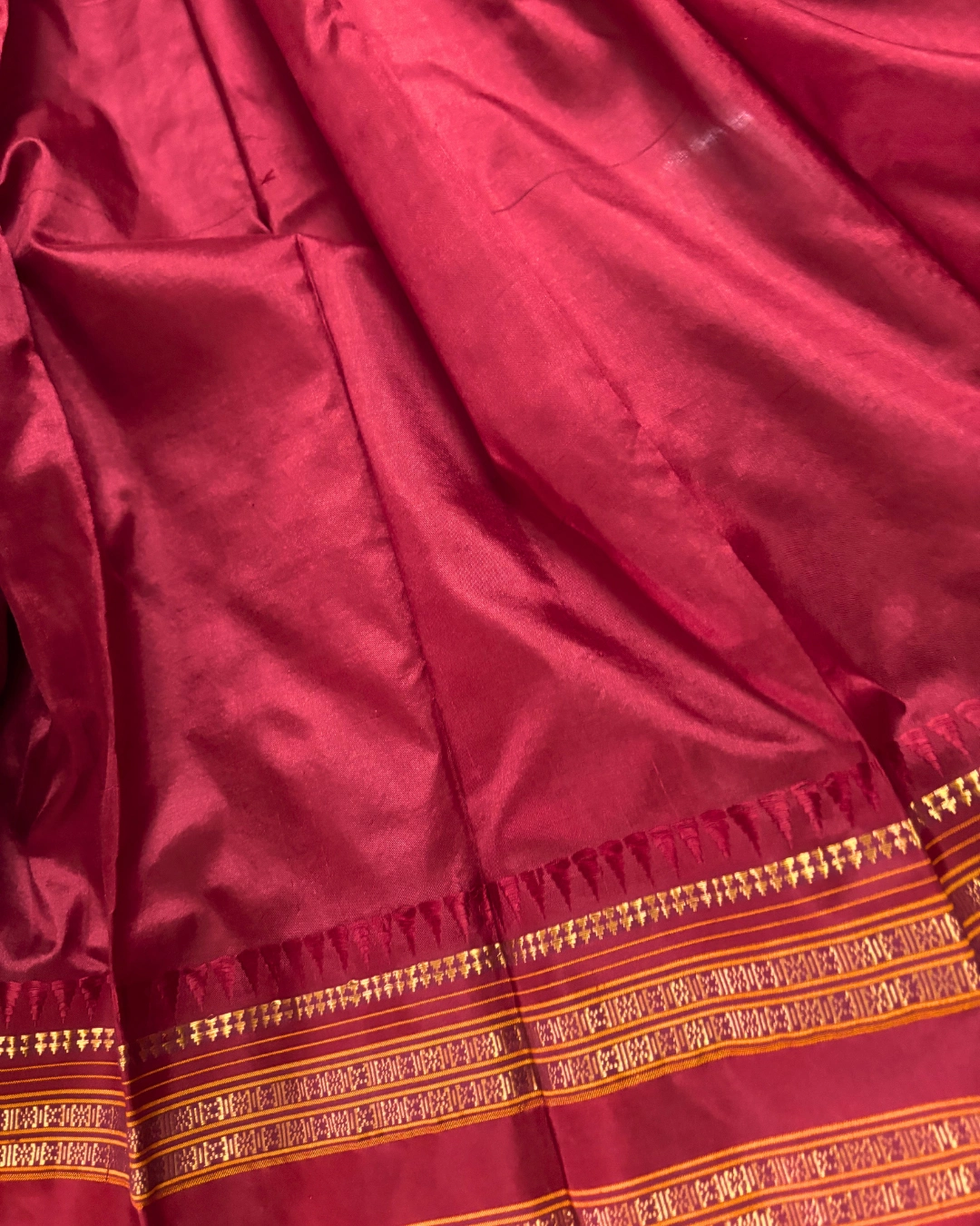 Step into the world of traditional grandeur with this authentic Narayanpet Silk Saree. Known for its distinctively crisp texture and vibrant light-reflecting properties, this silk saree is a testament to the skill of the Telangana weaver community.