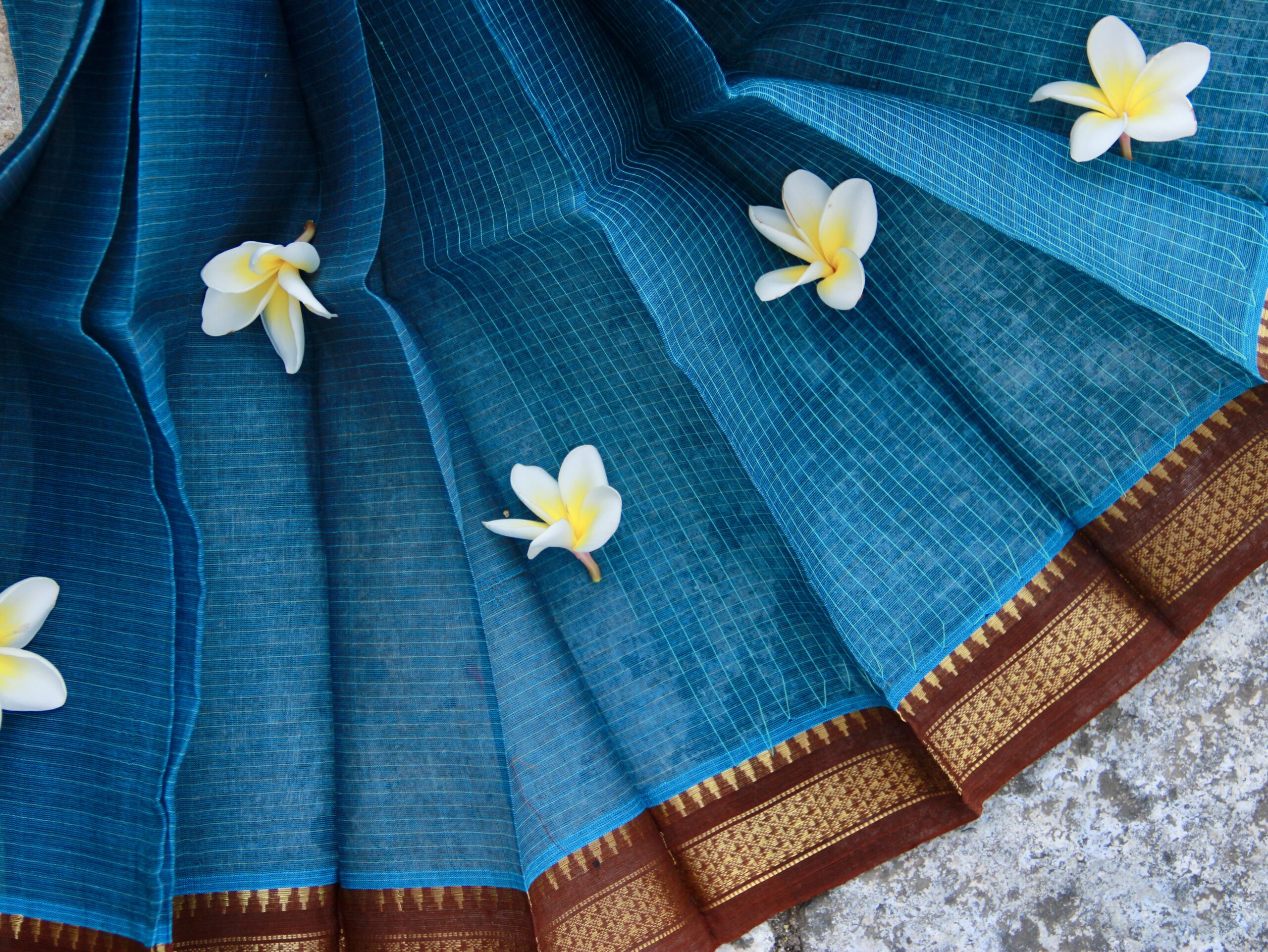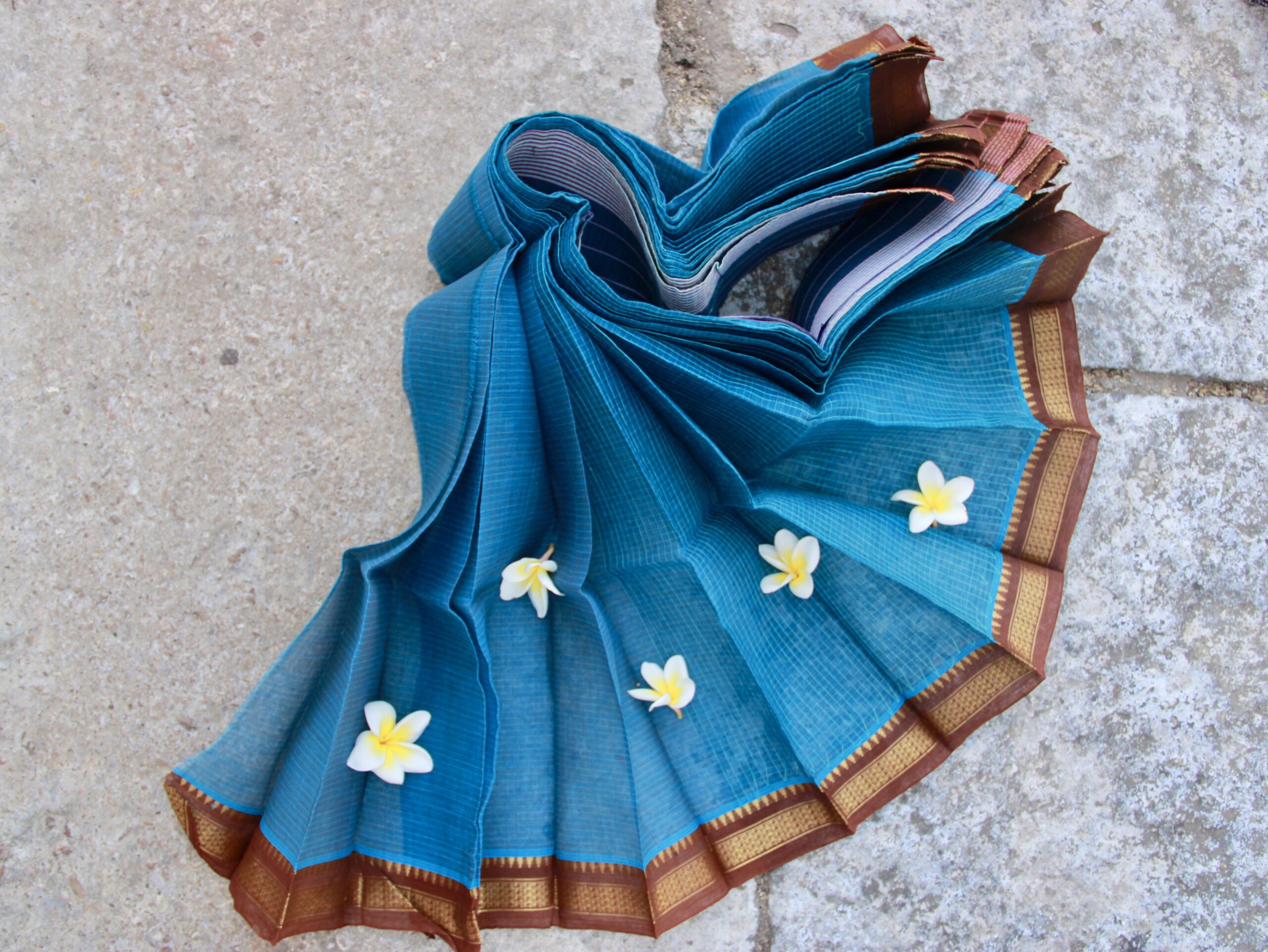 A stunning Narayanpet cotton saree featuring a rich deep ocean blue body with delicate check-line weaving, complemented by a classic brown and gold temple border and traditional pallu. Lightweight, breathable, and perfect for festive elegance, cultural wear, and everyday traditional styling.