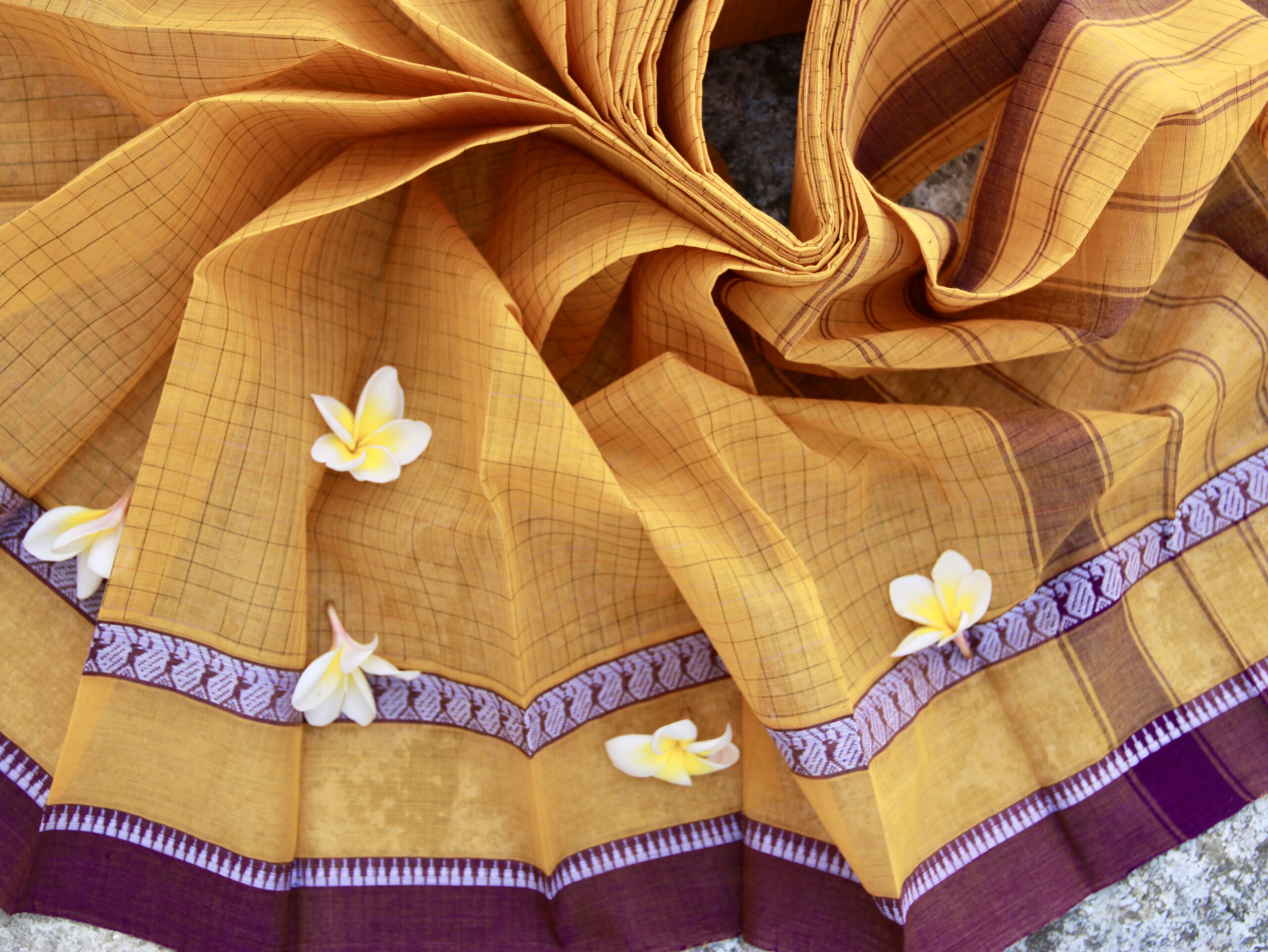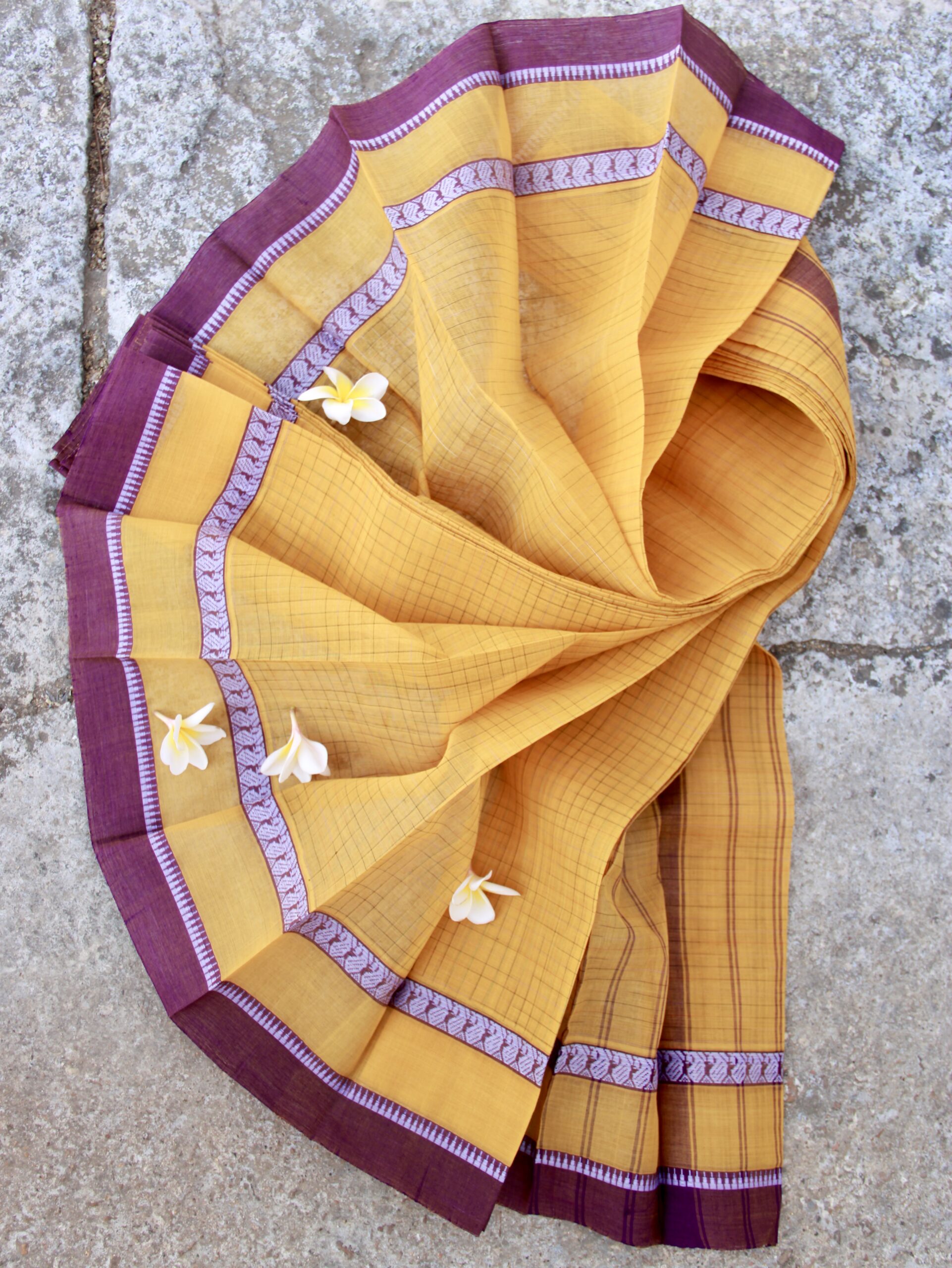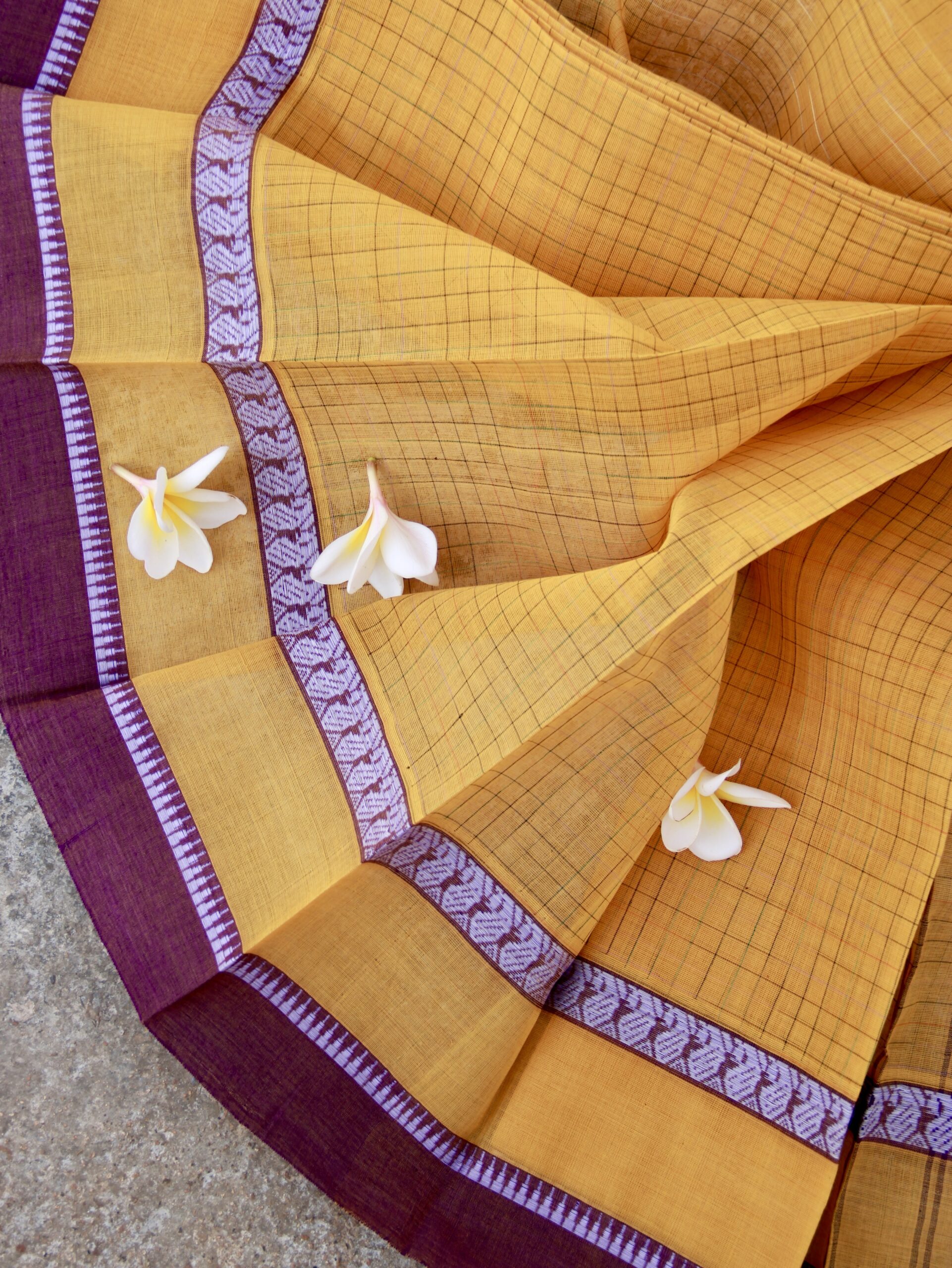 Narayanpet Cotton Saree – Mustard Yellow Body with Purple Traditional Border & Elegant Checks Weave