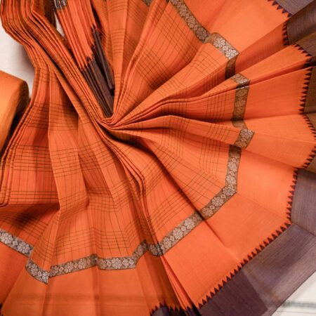The contrast pink temple border—crafted with Narayanpet’s iconic triangular motifs and finished with rich gold zari lines—adds a bold, traditional charm to the drape. Lightweight, lustrous, and crisp, this saree is handwoven by skilled Telangana artisans, making it perfect for celebrations, cultural events, and special occasions.