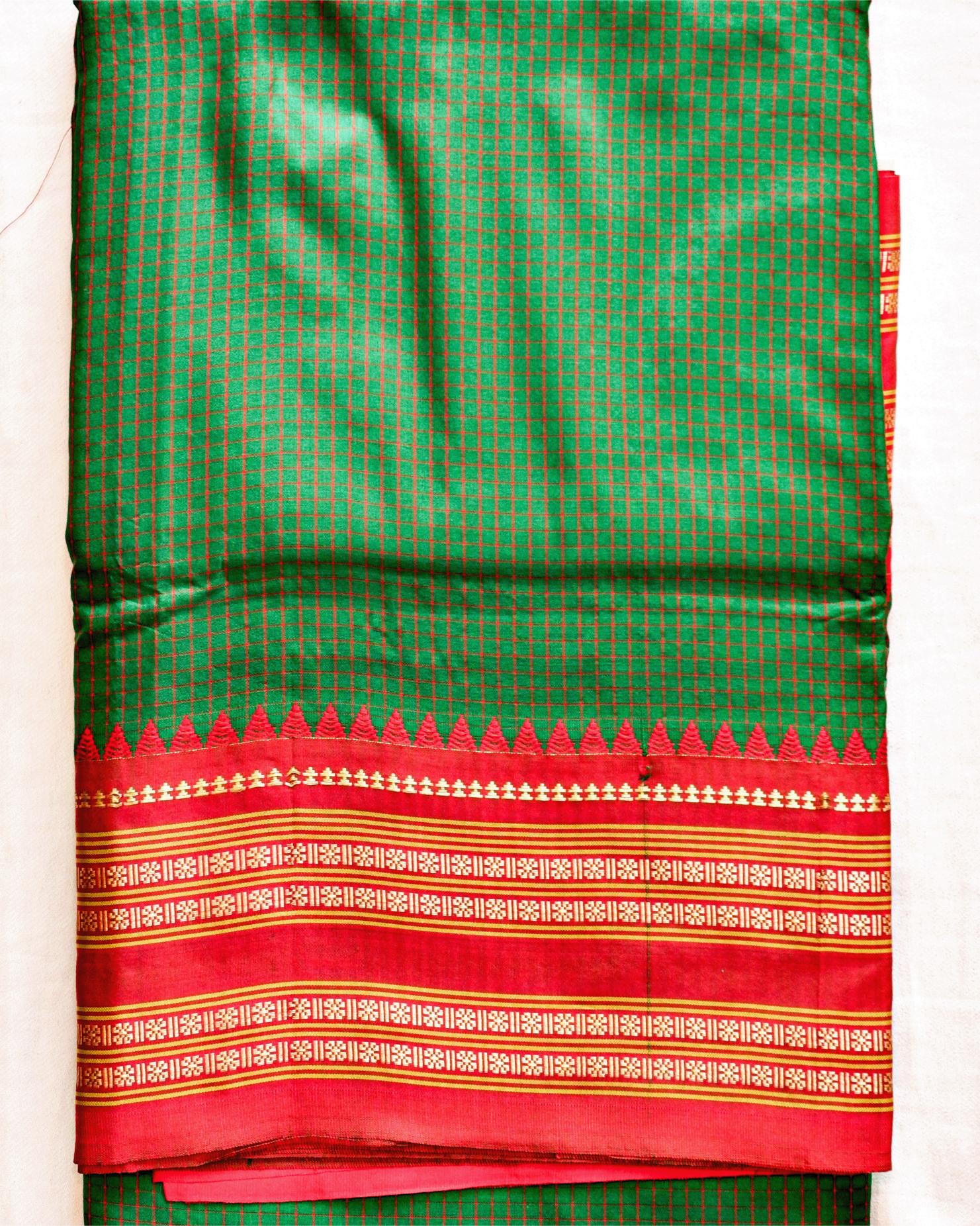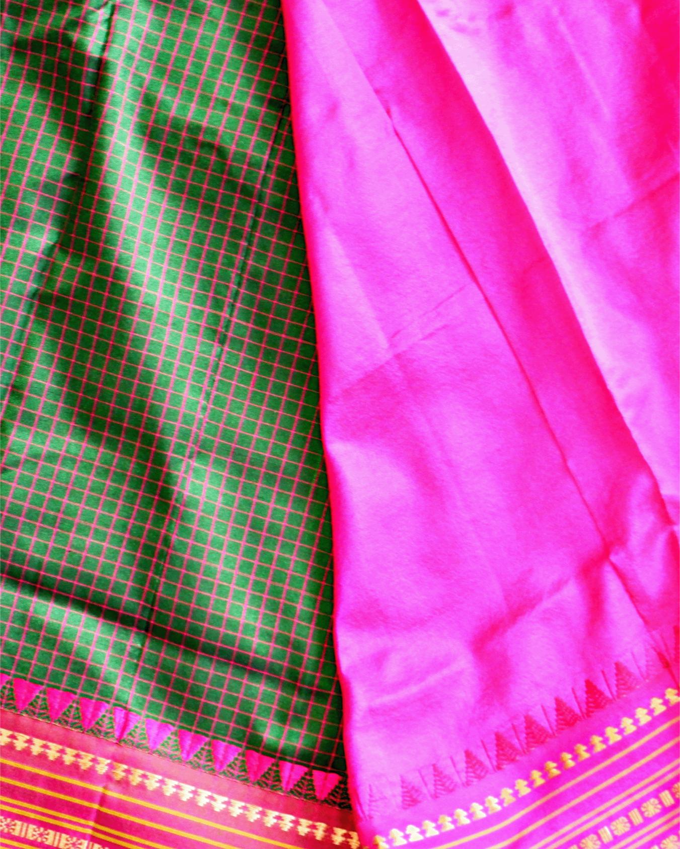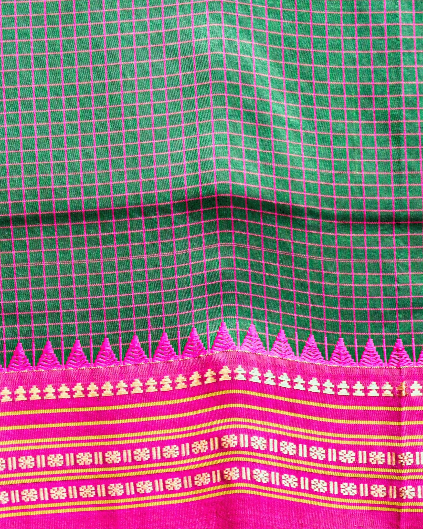 Narayanpet Handloom Pure Silk Saree – Leaf Green Checks with Pink Temple Zari Border