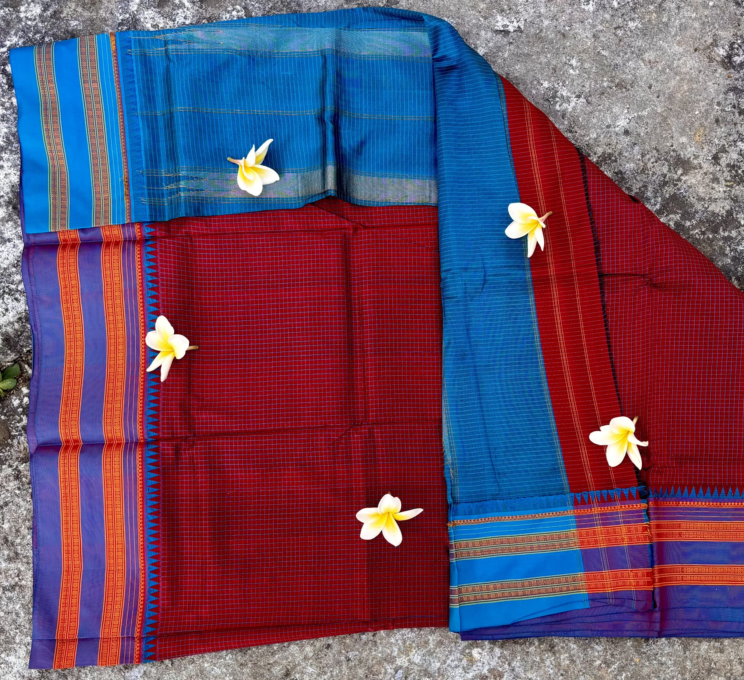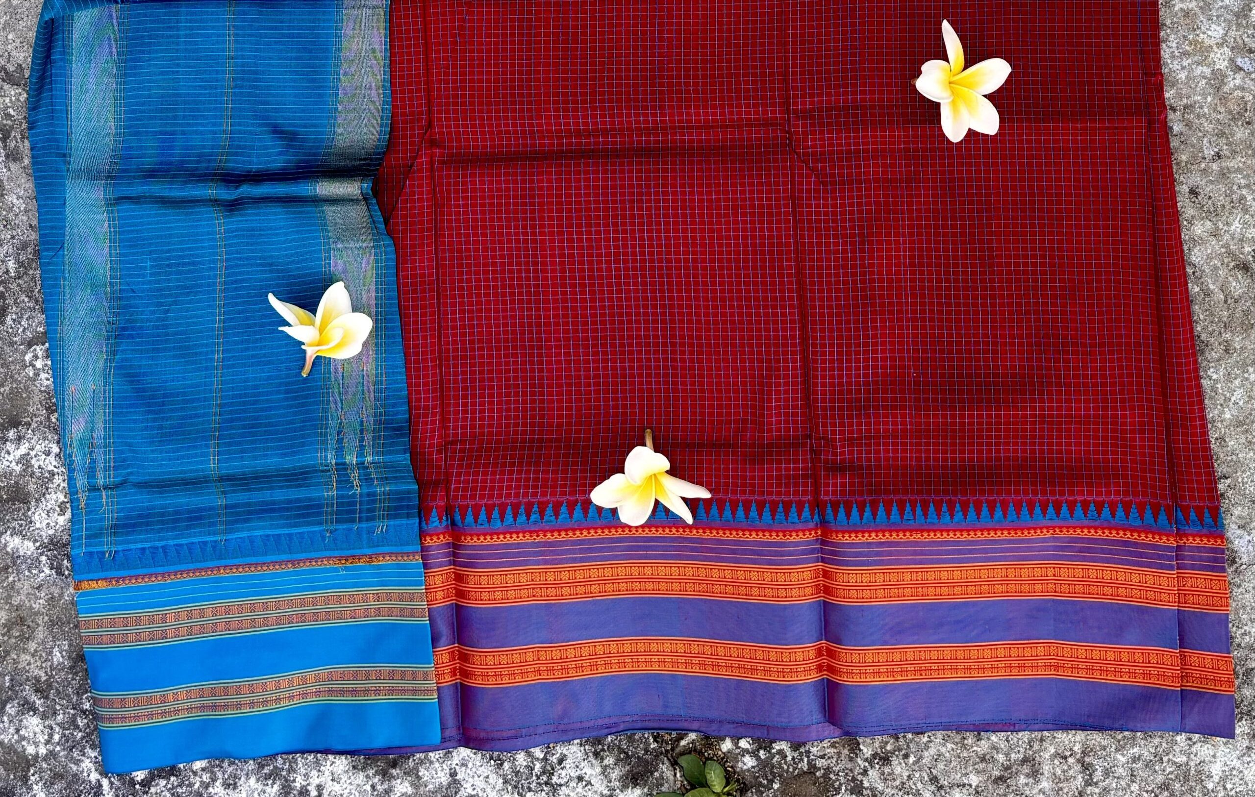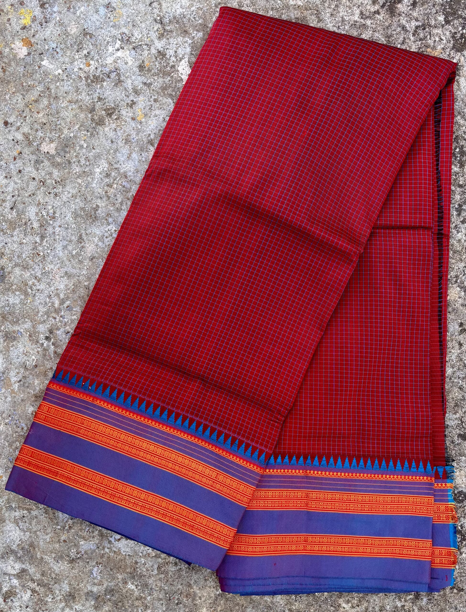 This saree showcases a brick red checked body paired with a stunning peacock blue pallu, finished with a striking contrast temple zari border in orange and gold. The intricate checks and traditional design reflect the authentic charm of Narayanpet looms.