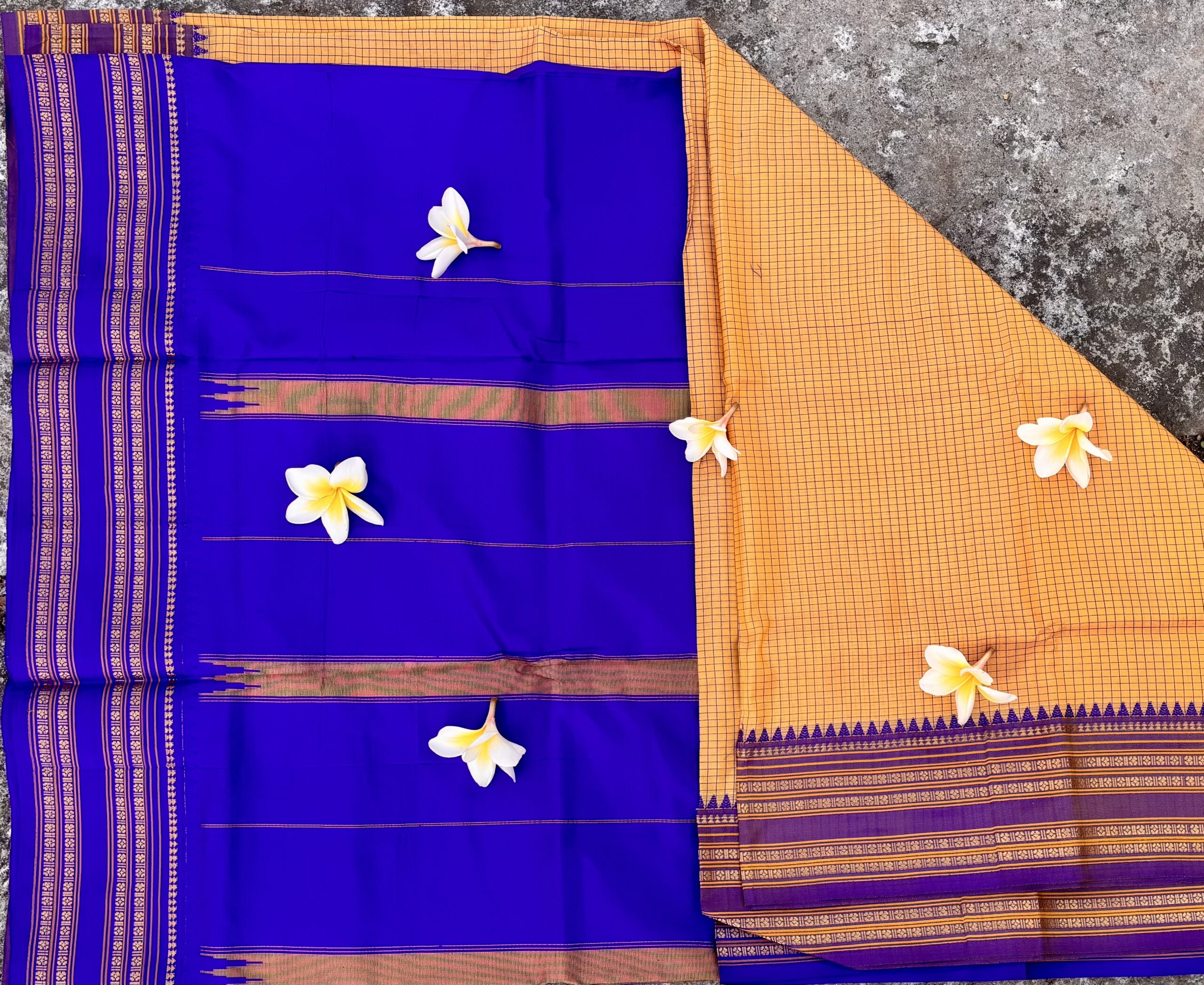 Deep royal blue body with mustard yellow checked pallu