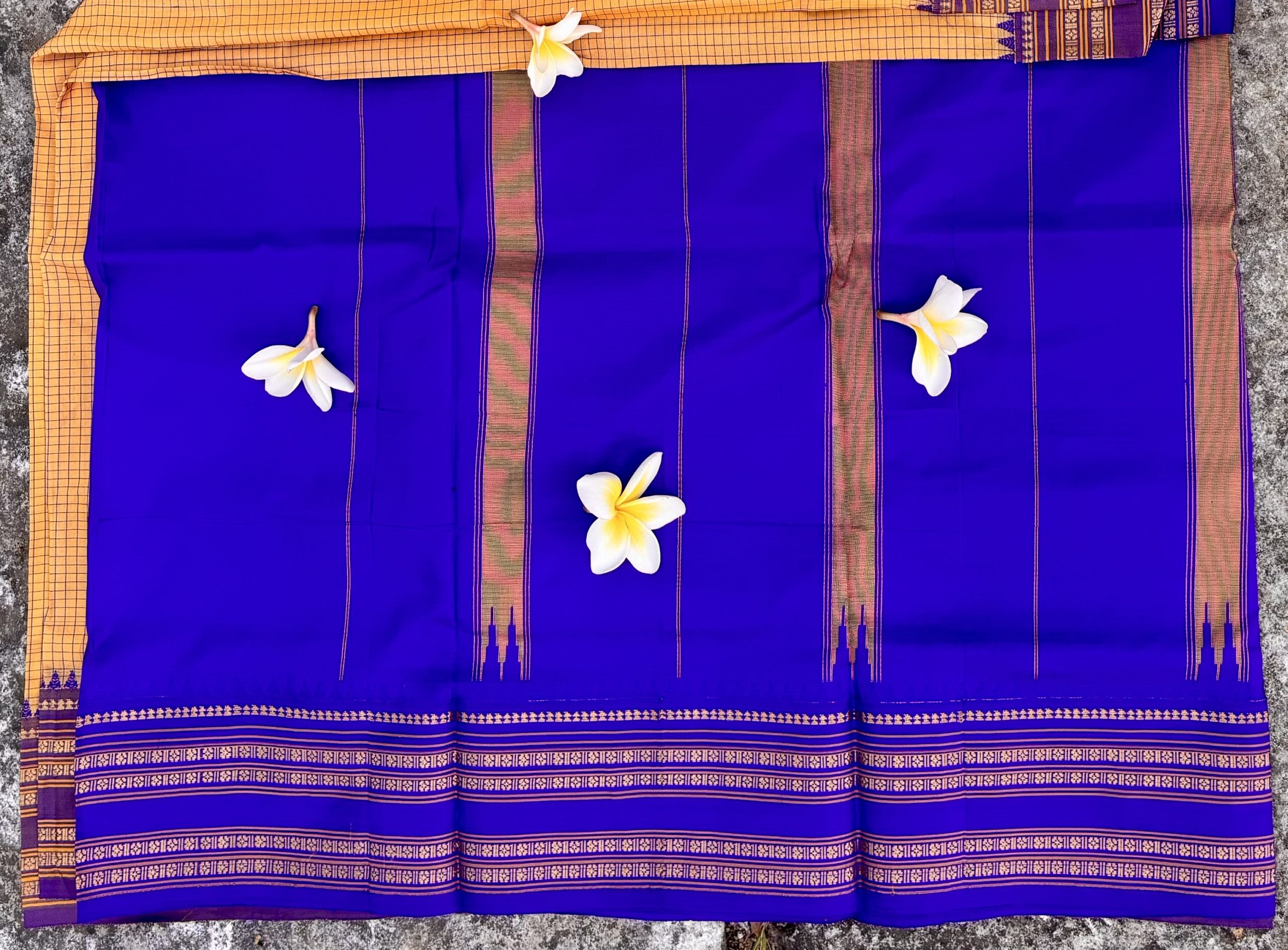 Narayanpet Handloom Saree – Deep Royal Blue Body with Mustard Checked Pallu & Traditional Zari Border