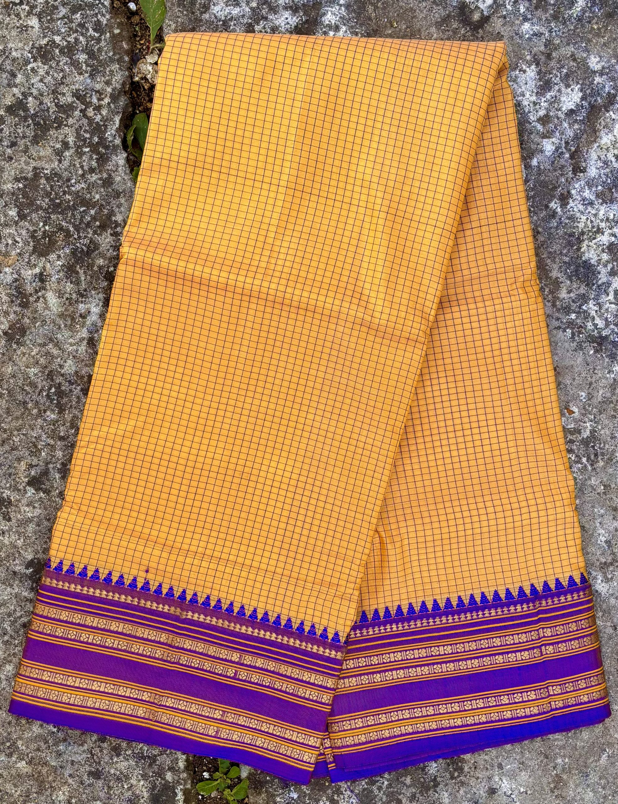 A gorgeous Narayanpet handloom saree featuring a deep royal blue body, stylish mustard yellow checked pallu, and classic purple-gold temple zari border. Lightweight, elegant, and perfect for festive occasions, weddings, and traditional wear.