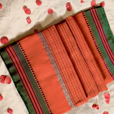 A beautifully woven traditional Narayanpet handloom saree featuring a rich royal purple body, striking red pallu, and classic Narayanpet orange zari border detailing. Lightweight, elegant, and perfect for festive wear, cultural celebrations, and traditional occasions.
