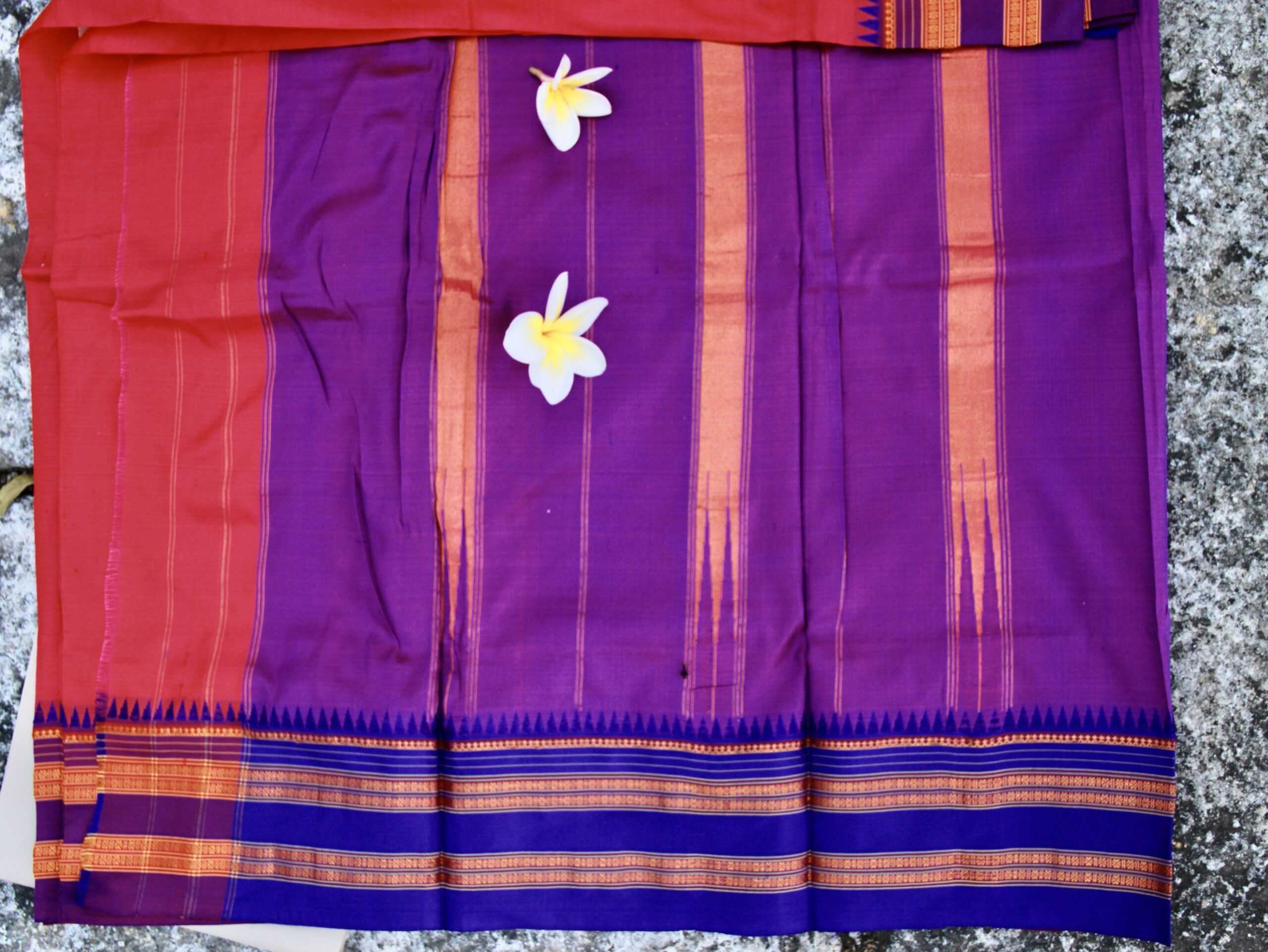 The saree features a royal purple body complemented by a bold red pallu, enhanced with signature orange zari stripes and temple-edged borders. The contrast tones and fine craftsmanship make it a beautiful blend of heritage and elegance.