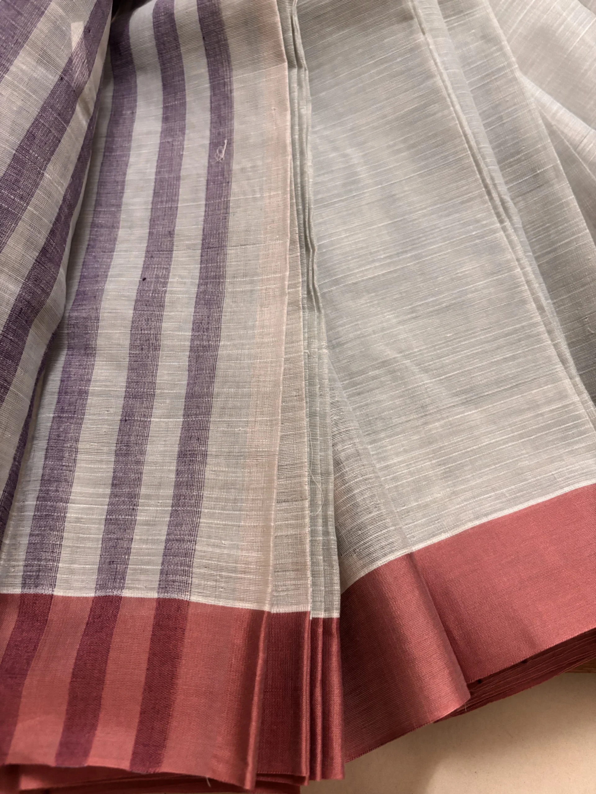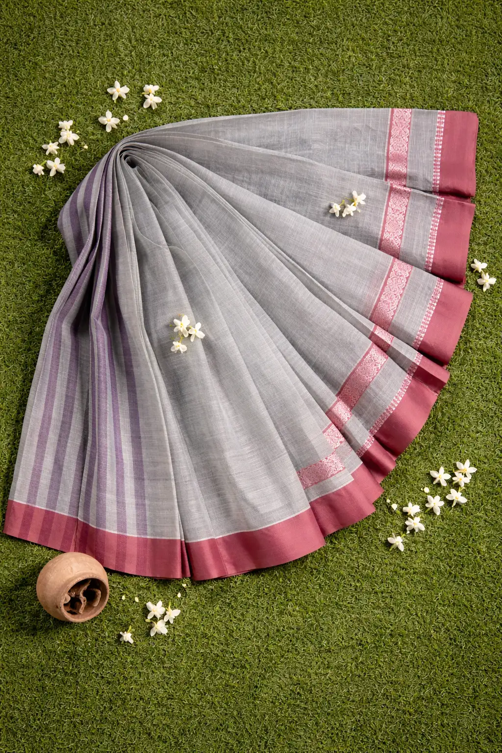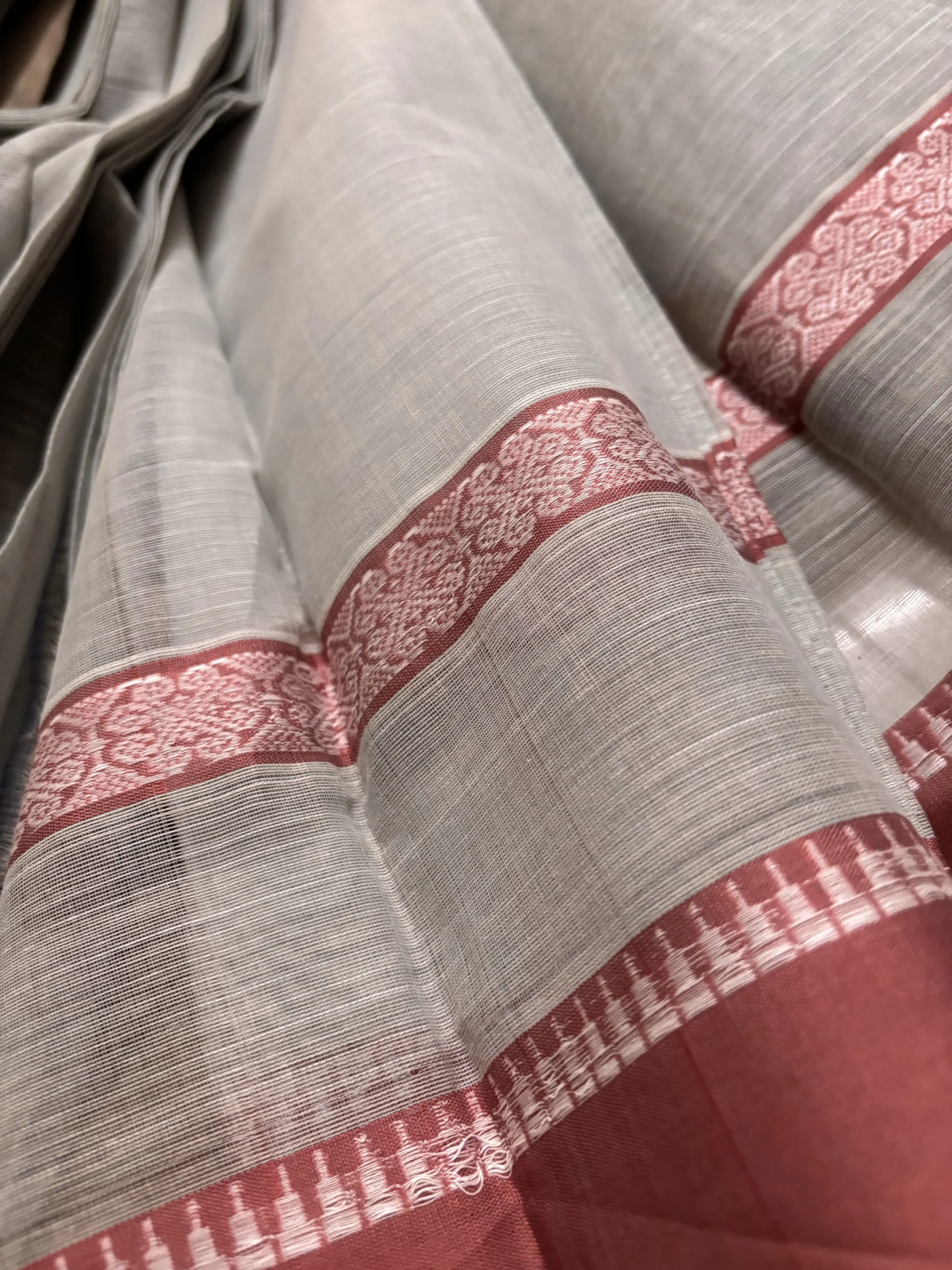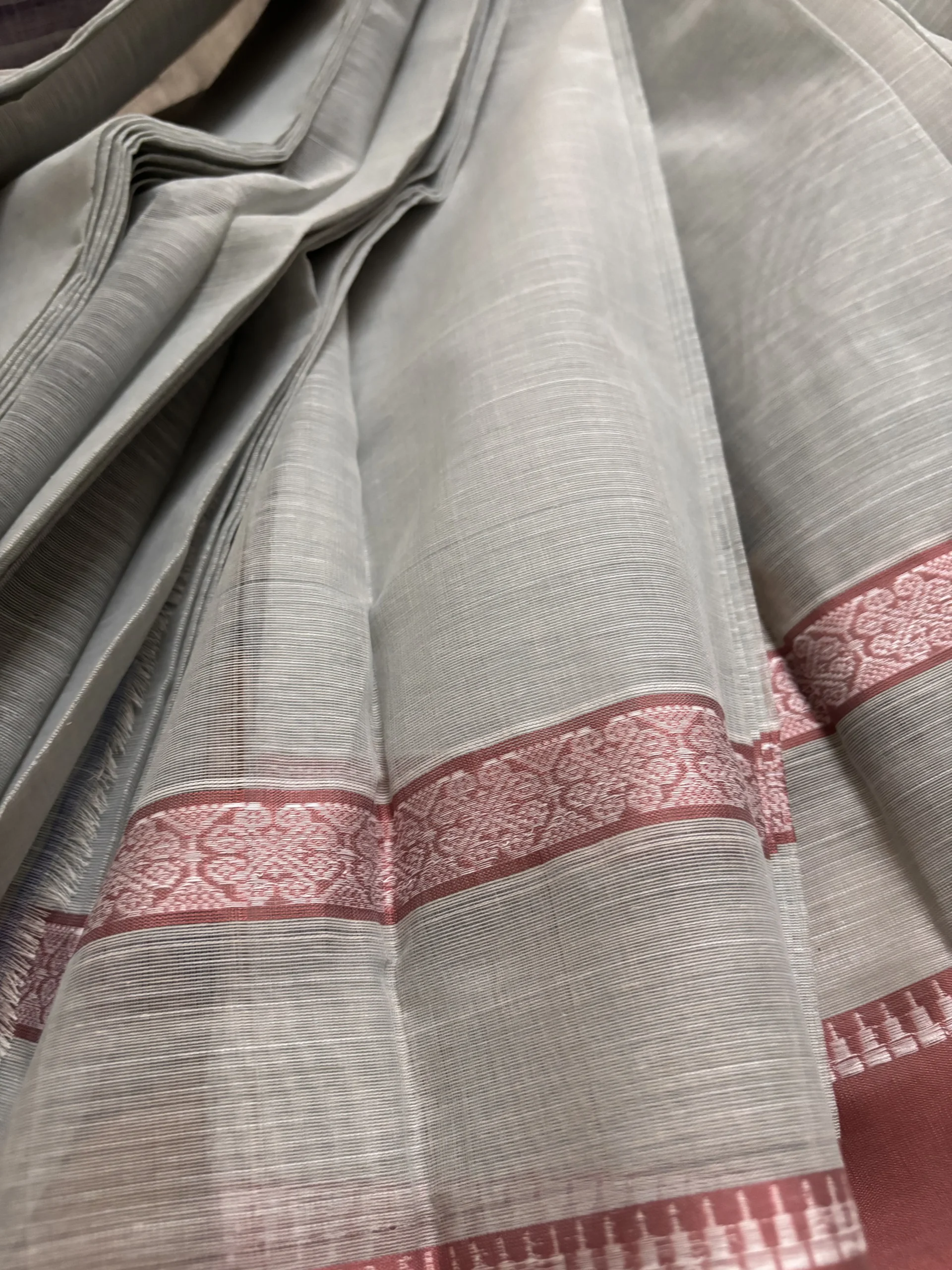 Pearl Grey & Rose Pink Contrast Narayanpet Handloom Cotton Saree with Temple Border
