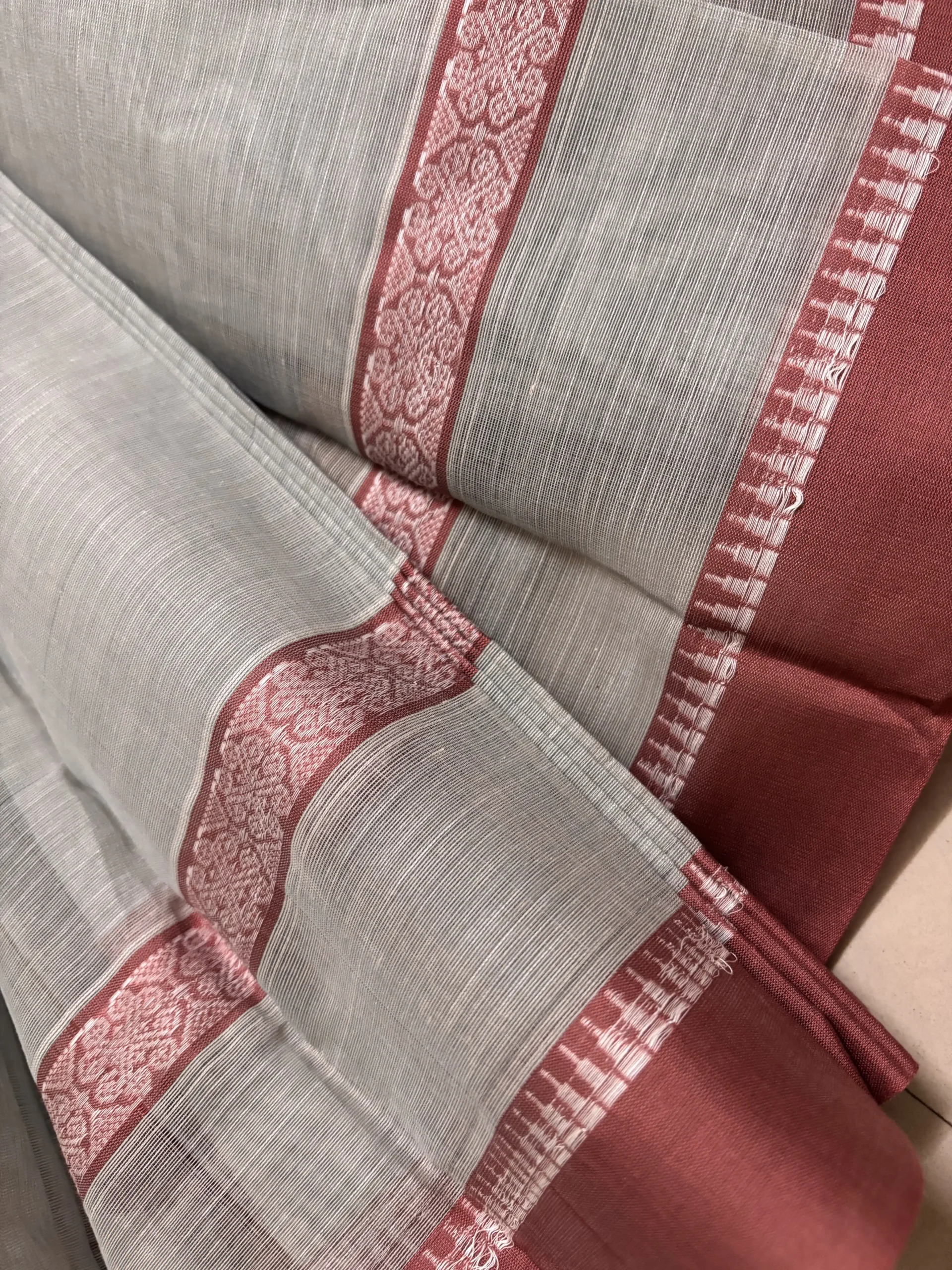 This saree embodies quiet elegance with a feminine touch. The pearl grey body offers a smooth, minimal canvas that highlights the natural texture of handloom cotton, creating a soft and sophisticated look.