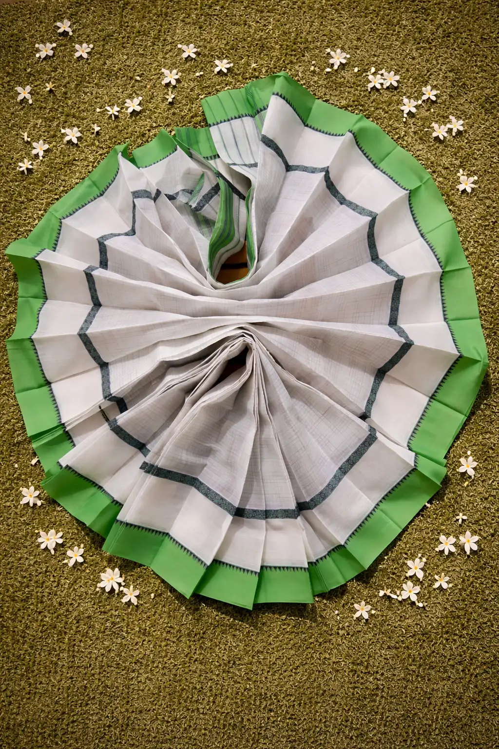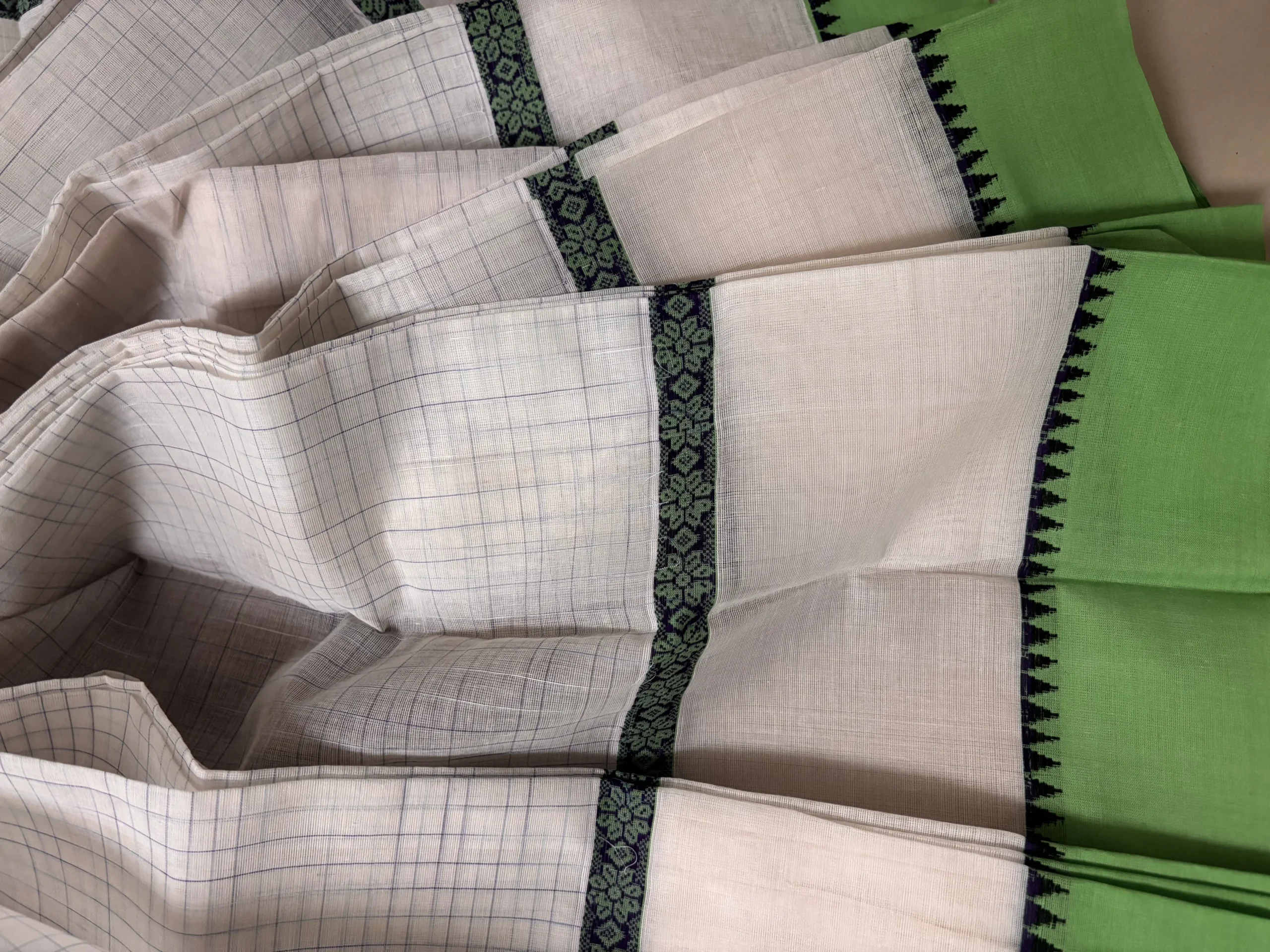 Pristine Off-White Narayanpet Handloom Saree with Dual-Tone Emerald & Parrot Green Border