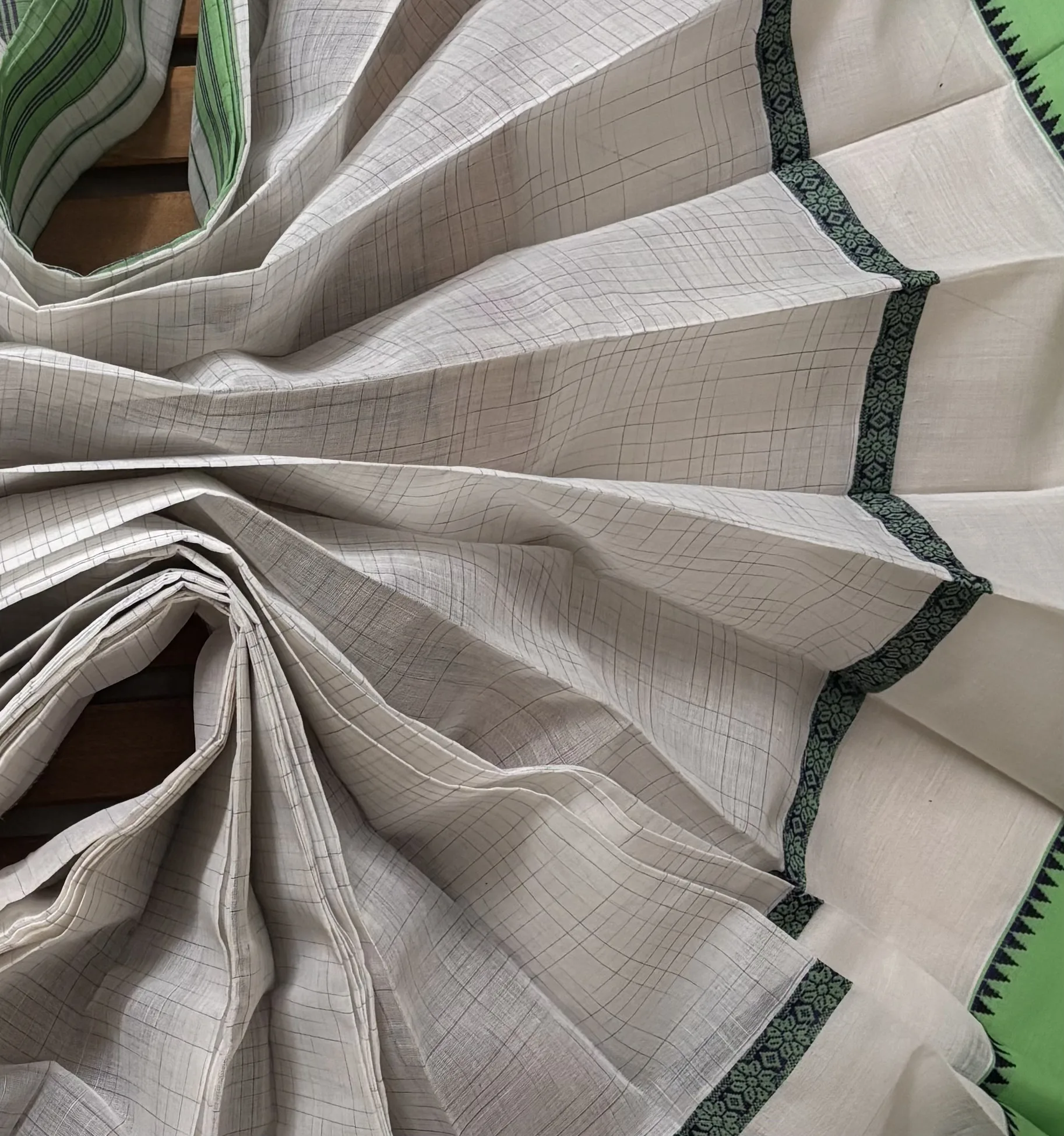 The standout feature is the architectural dual-layered border. It transitions from a thin, sharp Deep Emerald Green stripe into a wider Parrot Green band, creating a “step” effect that adds visual height and structure to the drape. Sourced directly from the heritage weaver clusters of Telangana, this saree is the perfect blend of natural tones and artisanal precision.