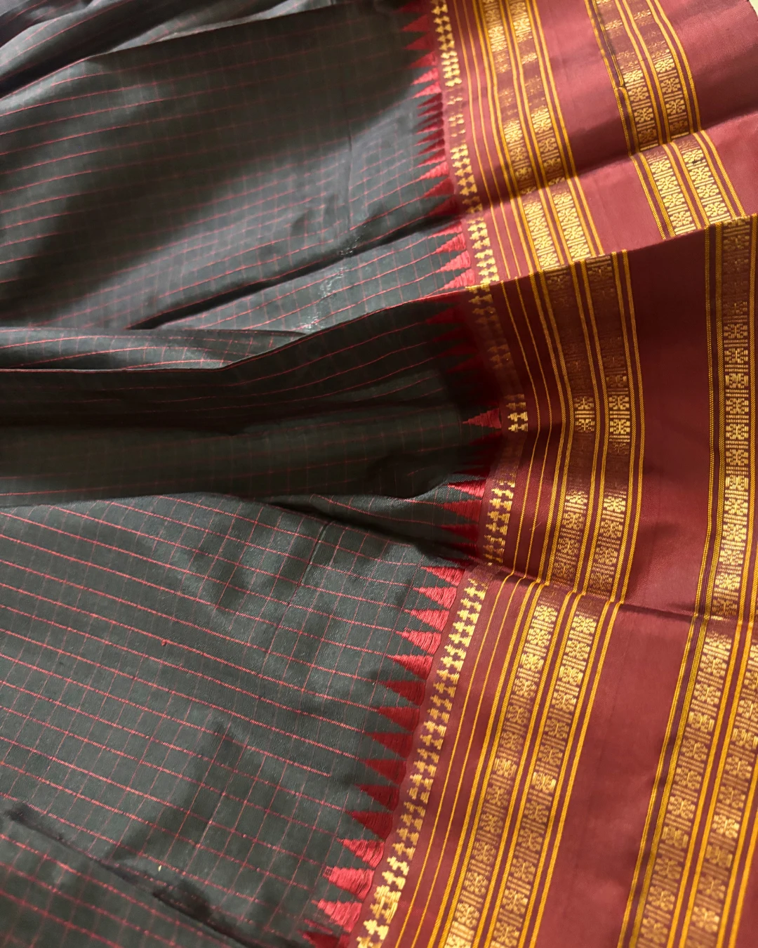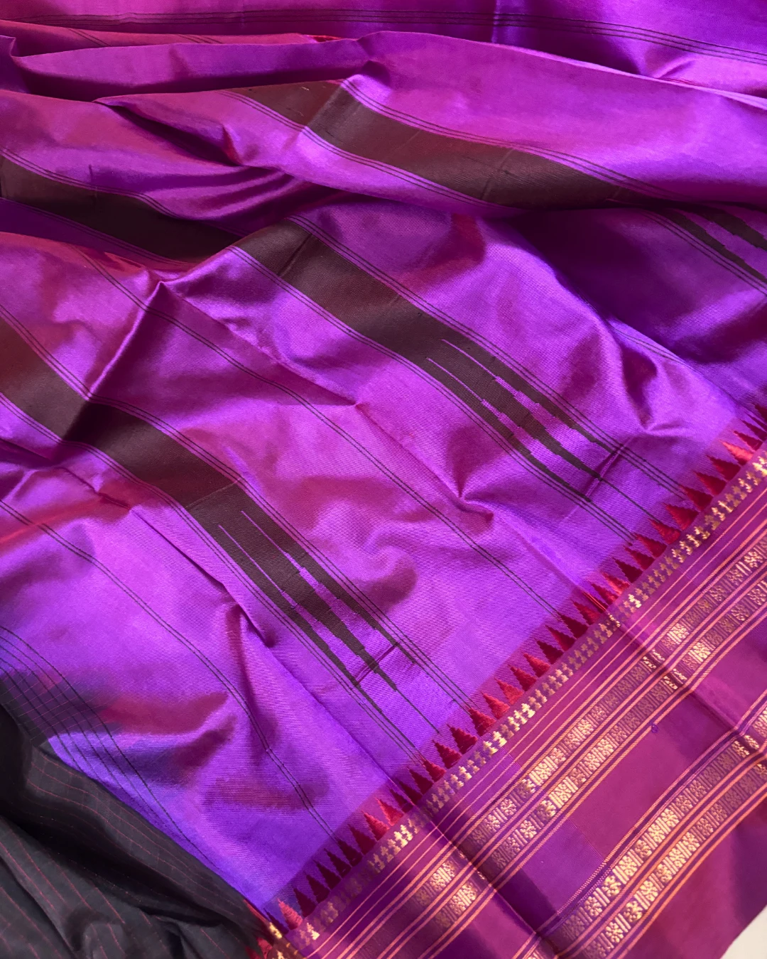 Zari Detail: Intricate Gold Zari temple weave and decorative horizontal banding on the border and pallu.