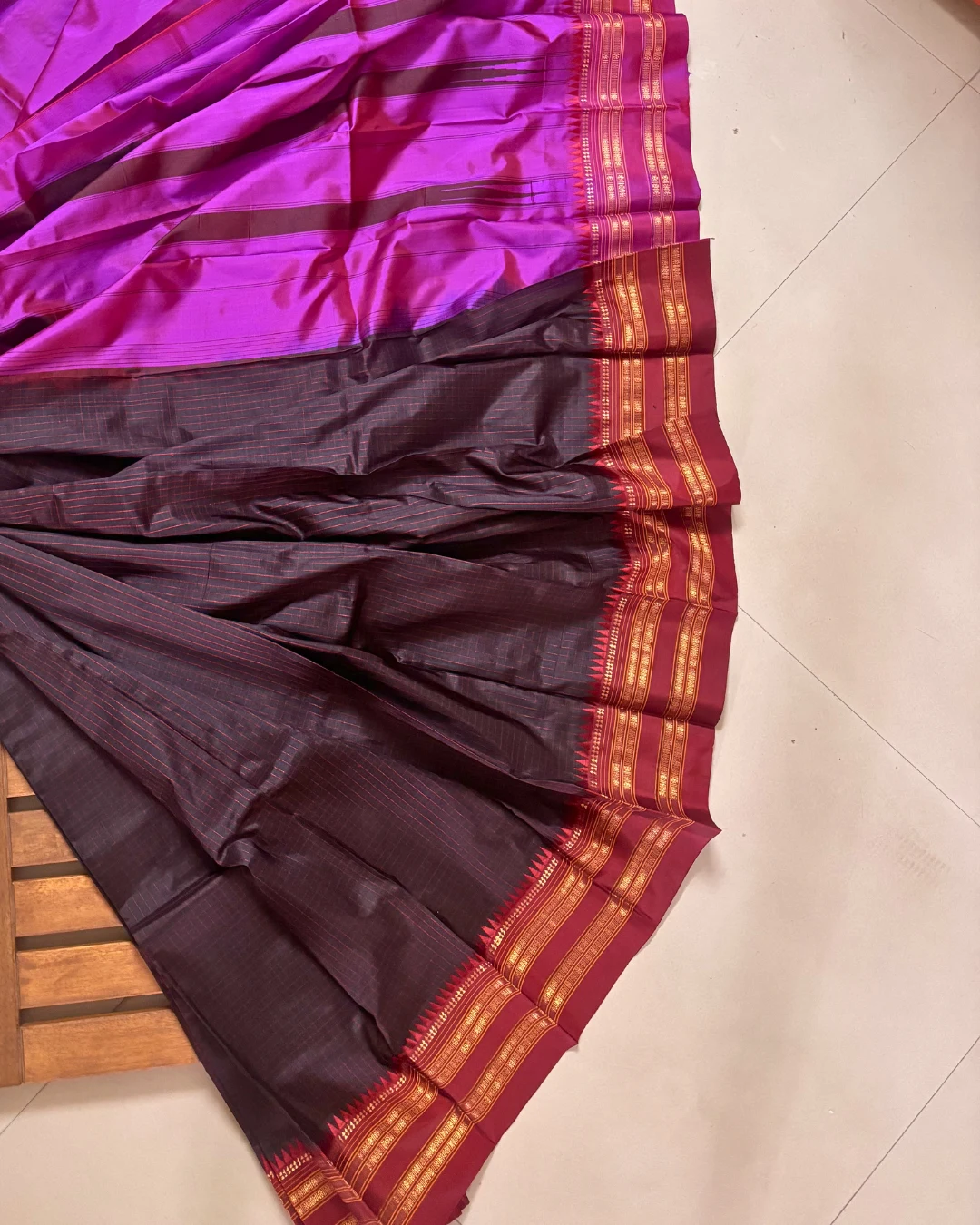 Bold, high-contrast, and avant-garde. This Narayanpet Handloom Silk Saree pairs a luminous Orchid Magenta body with a striking Deep Charcoal border. Accented with traditional gold zari temple motifs and horizontal bands, it offers a dramatic, regal drape for evening galas, weddings, and premium festive events.