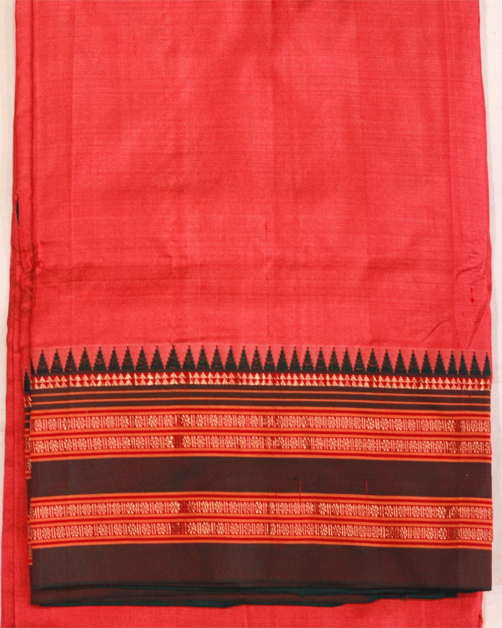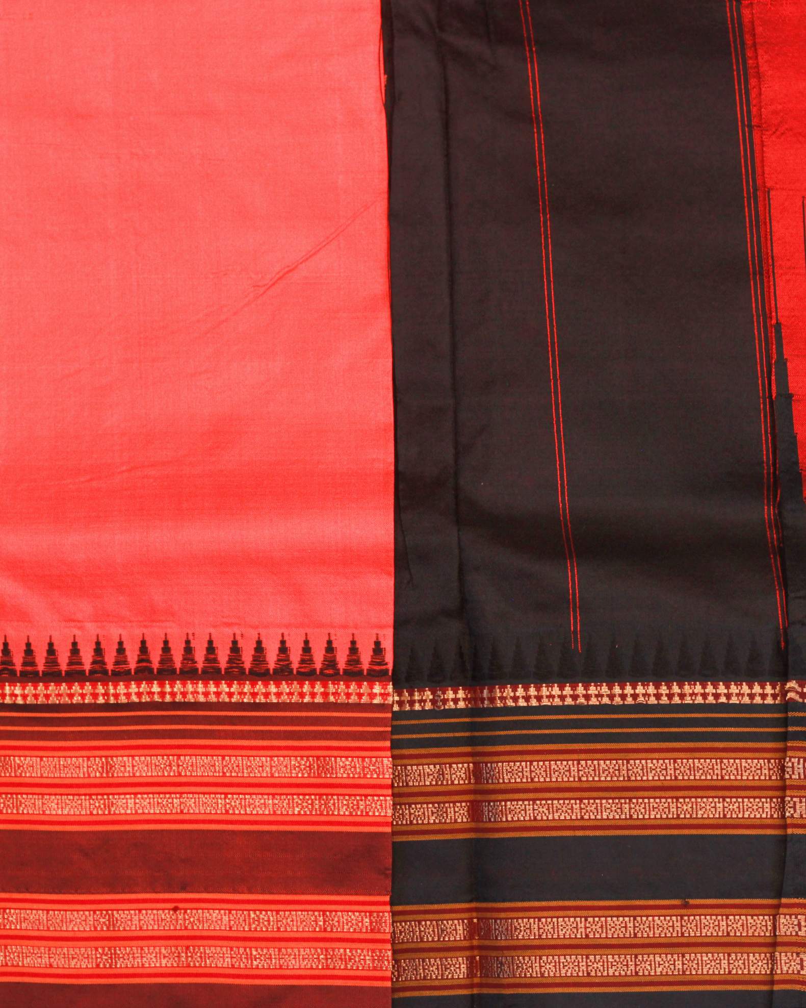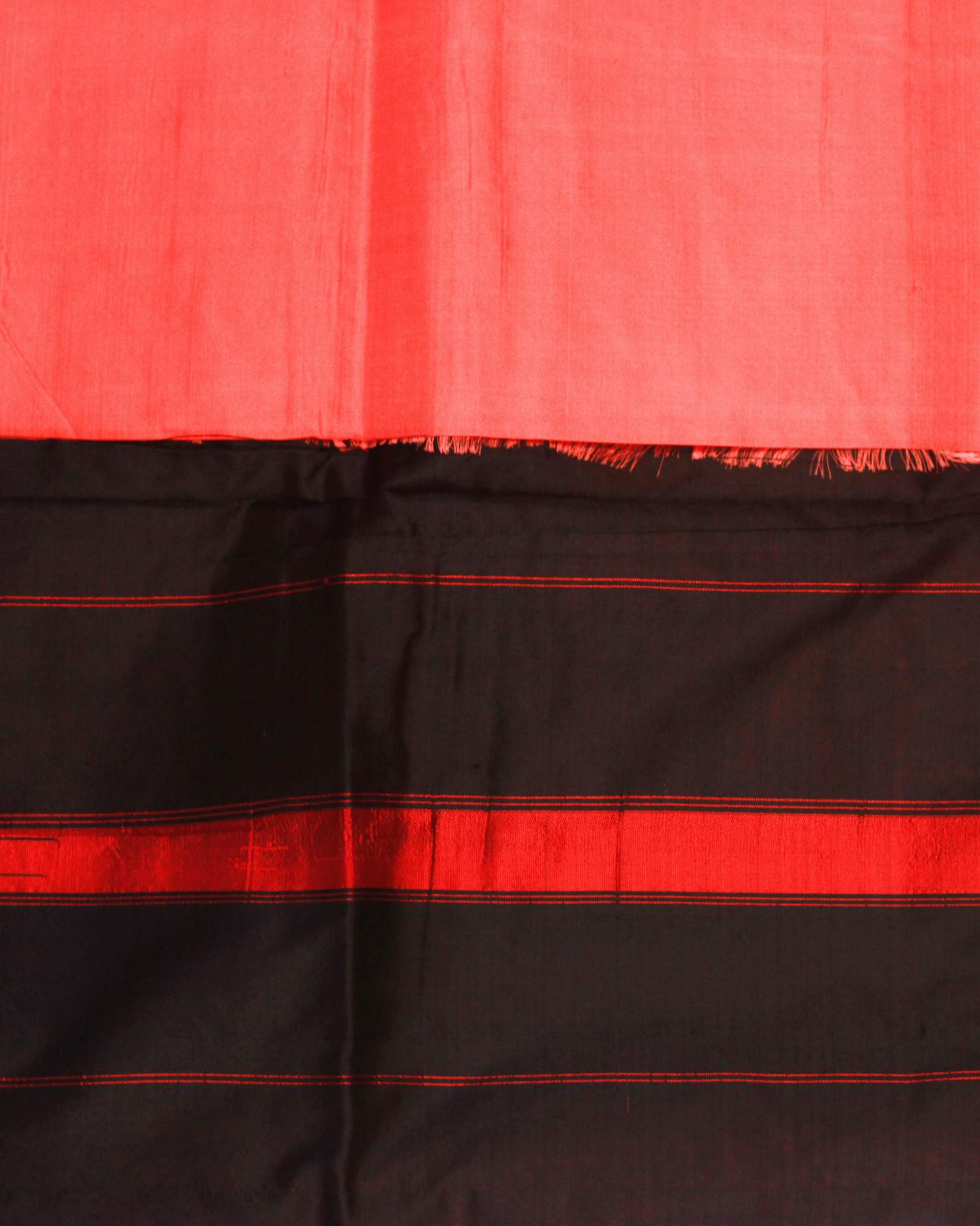 Radiate grace and power in this exquisite Rose Red and Black Narayanpet Handloom Silk Saree, a true reflection of Telangana’s weaving heritage. Handwoven by traditional artisans on pit looms, this saree combines the rich vibrance of rose red with the elegant depth of black, highlighted by a delicate golden zari border that lends it a regal aura.