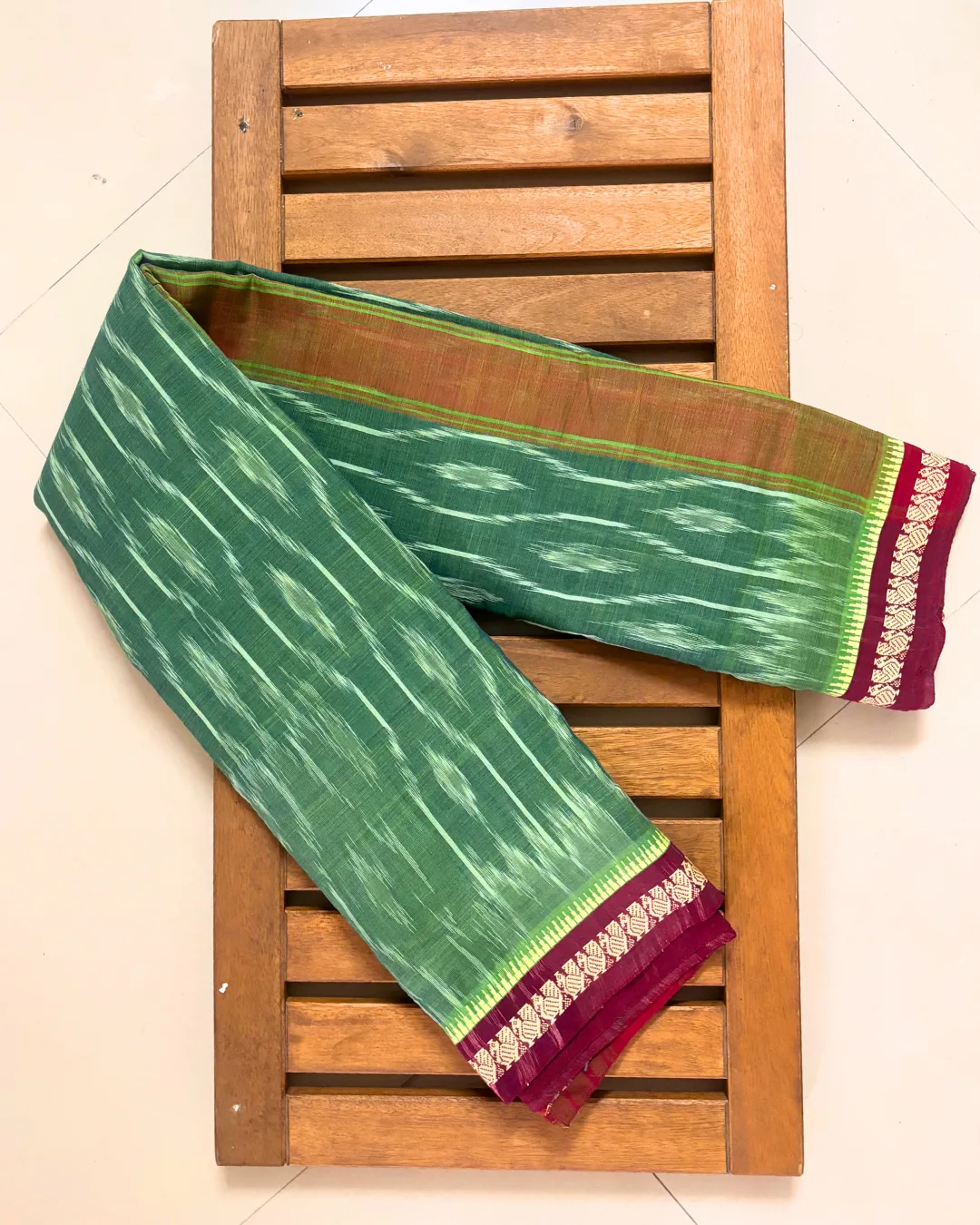 • Subsequent Washes: Gentle hand wash in cold water using a pH-neutral detergent (like Ezee). Do not scrub the Ikkat patterns.