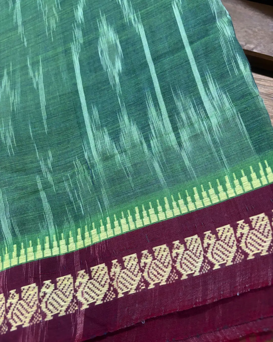 Earthy, artisanal, and intricately woven. This Handloom Saree features a Sage Green body with a stunning all-over Ikkat “Lehariya” pattern. Framed by a rich Plum Wine border featuring traditional Annapakshi (Swan) motifs and a temple weave, it is a perfect blend of geometric precision and heritage storytelling.