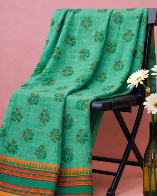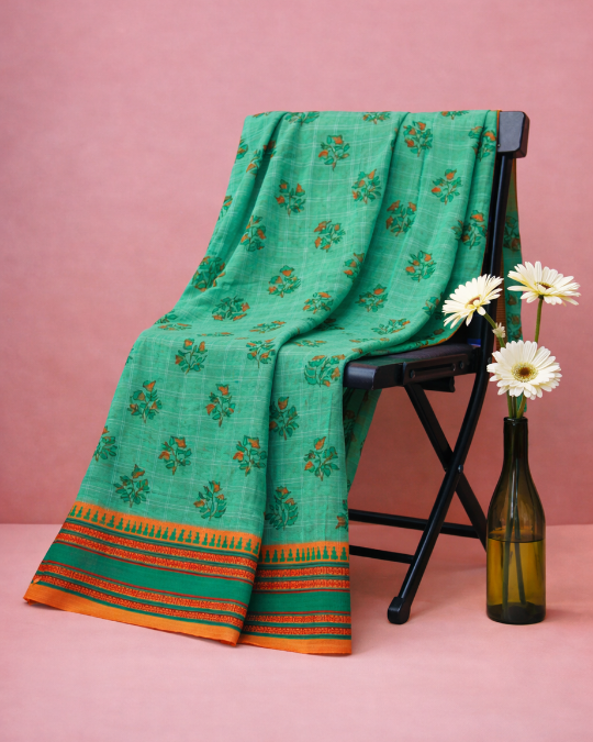 This saree celebrates the muted, organic beauty of the Deccan landscape. The earthy sage green body provides a serene backdrop for bold rust-red floral-vine prints, framed by the iconic Narayanpet “Gopuram” border in a deep terracotta-rust. Directly sourced from the weaver clusters of Telangana, this piece is a masterclass in balancing traditional motifs with a modern, earthy palette.