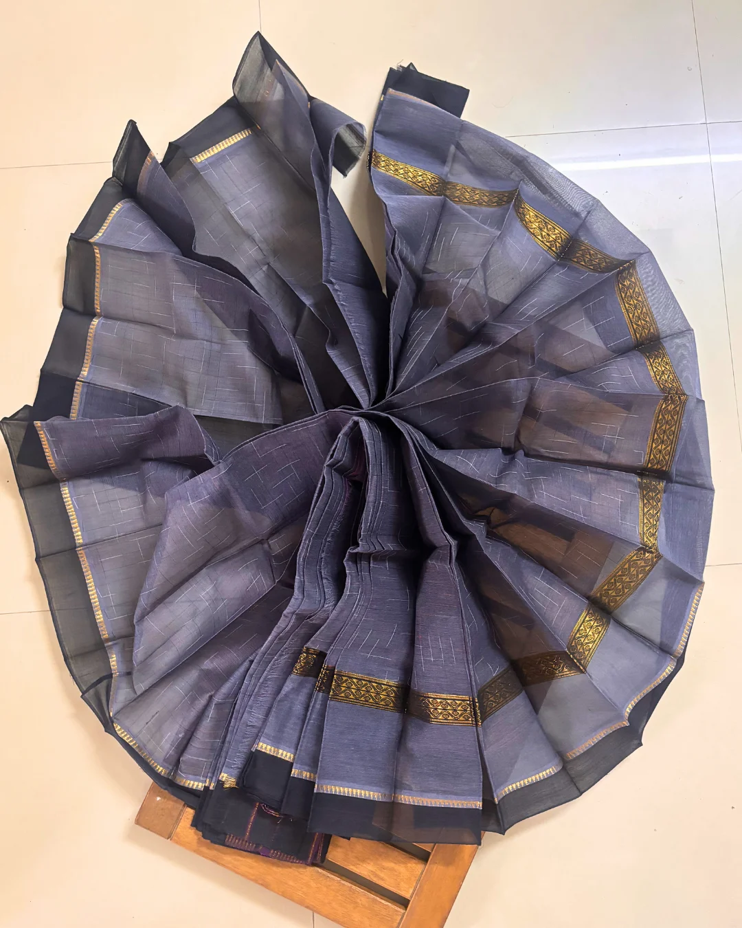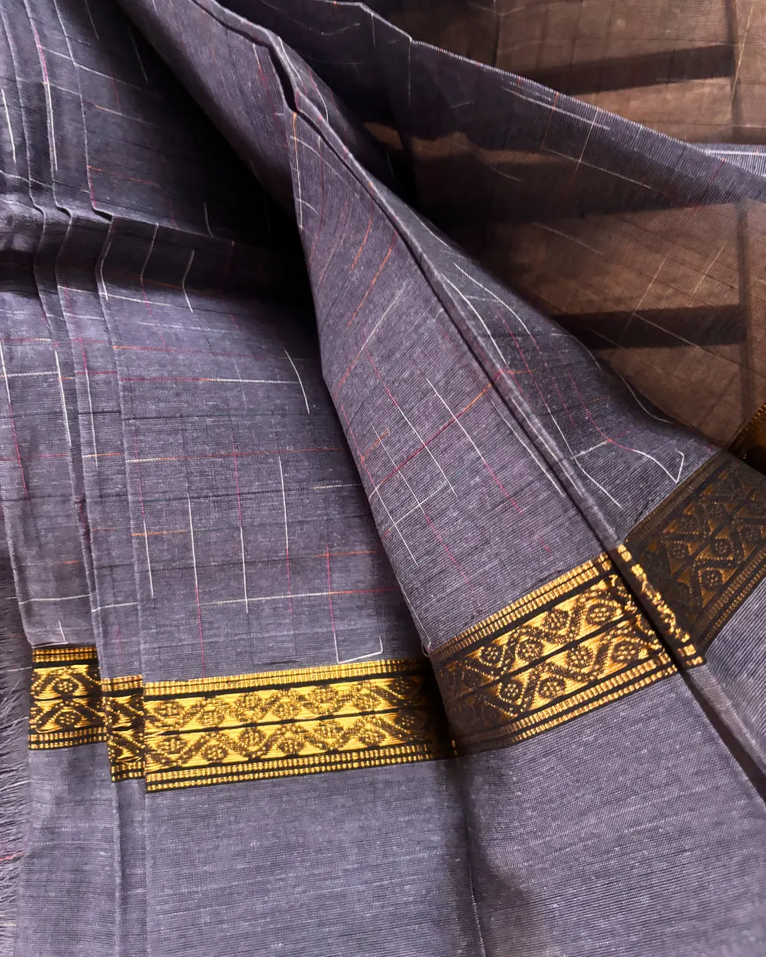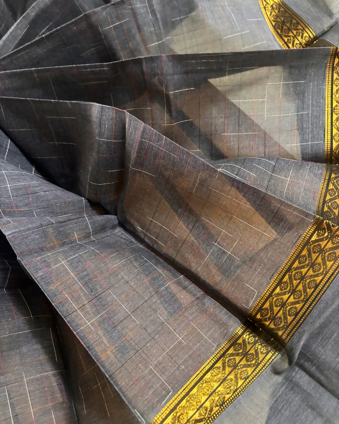 Slate Grey & Gold Zari Border Narayanpet Handloom Cotton Saree with Subtle Checks