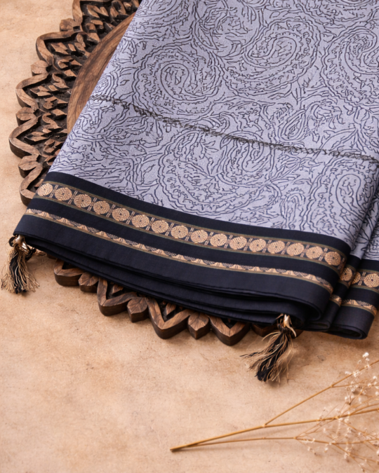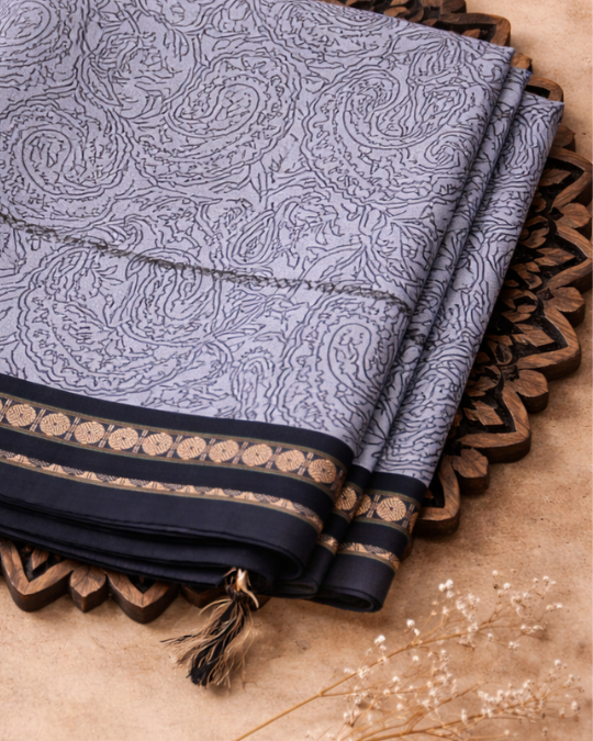 Slate Grey & Midnight Blue Paisley Printed Narayanpet Handloom Cotton Saree