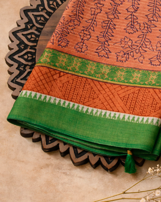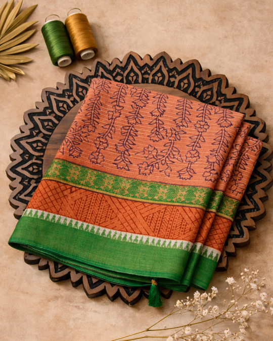 This saree carries the warmth of sunbaked earth and the freshness of monsoon greens. The terracotta brown base is adorned with vertical floral vine motifs in deep indigo, creating a rhythmic, elongating visual flow across the body.